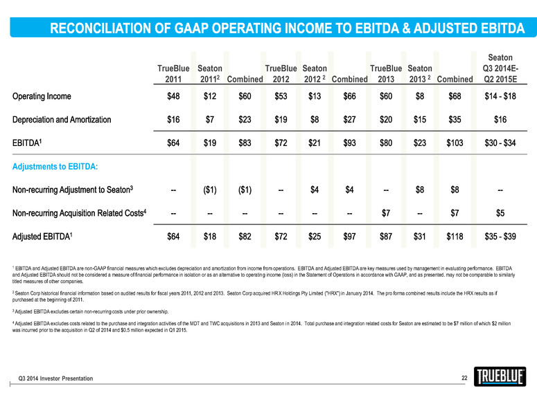 Q3 2014E Reflects Appropriate Changes from Seaton Acquisition Q3 2014E Q2 2014 EBITDA and Adjusted EBITDA are non-GAAP financial measures. EBITDA excludes interest, taxes, depreciation and amortization from net income. Adjusted EBITDA further excludes from EBITDA non-recurring costs related to the purchase, integration, reorganization and shutdown activities related to acquisitions. EBITDA and Adjusted EBITDA are key measures used by management in evaluating performance. EBITDA and Adjusted EBITDA should not be considered a measure of financial performance in isolation or as an alternative to income from operations in the Consolidated Statements of Operations in accordance with GAAP, and, as presented, may not be comparable to similarly titled measures of other companies. Q3 2014 Investor Presentation 21