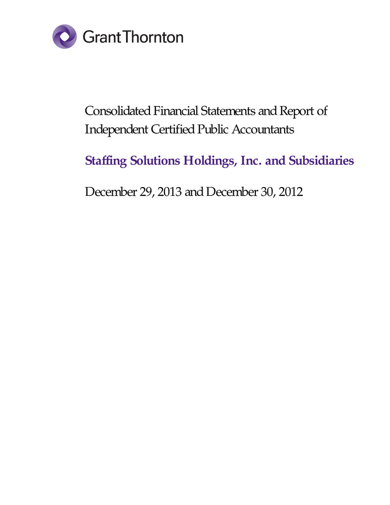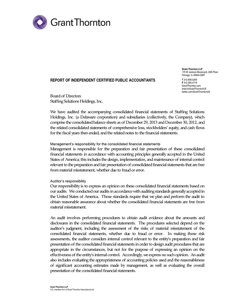 Grant Thornton LLP 175 W Jackson Boulevard, 20th Floor Chicago, IL 60604-2687 T 312.856.0200 F 312.565.4719 GrantThornton.com linkd.in/GrantThorntonUS twitter.com/GrantThorntonUS Grant Thornton LLP U.S. member firm of Grant Thornton International Ltd REPORT OF INDEPENDENT CERTIFIED PUBLIC ACCOUNTANTS Board of Directors Staffing Solutions Holdings, Inc. We have audited the accompanying consolidated financial statements of Staffing Solutions Holdings, Inc. (a Delaware corporation) and subsidiaries (collectively, the Company), which comprise the consolidated balance sheets as of December 29, 2013 and December 30, 2012, and the related consolidated statements of comprehensive loss, stockholders’ equity, and cash flows for the fiscal years then ended, and the related notes to the financial statements. Management’s responsibility for the consolidated financial statements Management is responsible for the preparation and fair presentation of these consolidated financial statements in accordance with accounting principles generally accepted in the United States of America; this includes the design, implementation, and maintenance of internal control relevant to the preparation and fair presentation of consolidated financial statements that are free from material misstatement, whether due to fraud or error. Auditor’s responsibility Our responsibility is to express an opinion on these consolidated financial statements based on our audits. We conducted our audits in accordance with auditing standards generally accepted in the United States of America. Those standards require that we plan and perform the audit to obtain reasonable assurance about whether the consolidated financial statements are free from material misstatement. An audit involves performing procedures to obtain audit evidence about the amounts and disclosures in the consolidated financial statements. The procedures selected depend on the auditor’s judgment, including the assessment of the risks of material misstatement of the consolidated financial statements, whether due to fraud or error. In making those risk assessments, the auditor considers internal control relevant to the entity’s preparation and fair presentation of the consolidated financial statements in order to design audit procedures that are appropriate in the circumstances, but not for the purpose of expressing an opinion on the effectiveness of the entity’s internal control. Accordingly, we express no such opinion. An audit also includes evaluating the appropriateness of accounting policies used and the reasonableness of significant accounting estimates made by management, as well as evaluating the overall presentation of the consolidated financial statements.