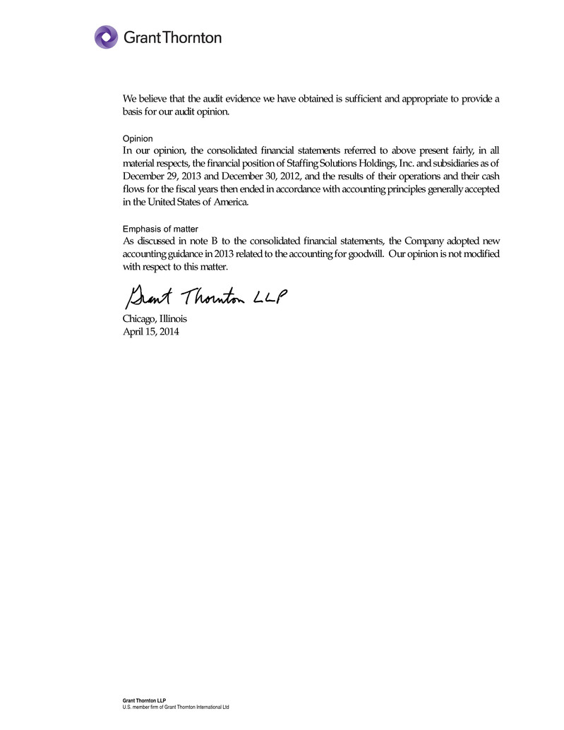 Grant Thornton LLP U.S. member firm of Grant Thornton International Ltd We believe that the audit evidence we have obtained is sufficient and appropriate to provide a basis for our audit opinion. Opinion In our opinion, the consolidated financial statements referred to above present fairly, in all material respects, the financial position of Staffing Solutions Holdings, Inc. and subsidiaries as of December 29, 2013 and December 30, 2012, and the results of their operations and their cash flows for the fiscal years then ended in accordance with accounting principles generally accepted in the United States of America. Emphasis of matter As discussed in note B to the consolidated financial statements, the Company adopted new accounting guidance in 2013 related to the accounting for goodwill. Our opinion is not modified with respect to this matter. Chicago, Illinois April 15, 2014