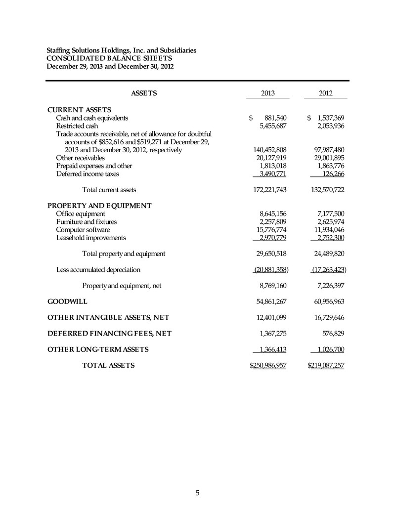 Staffing Solutions Holdings, Inc. and Subsidiaries CONSOLIDATED BALANCE SHEETS December 29, 2013 and December 30, 2012 5 ASSETS 2013 2012 CURRENT ASSETS Cash and cash equivalents $ 881,540 $ 1,537,369 Restricted cash 5,455,687 2,053,936 Trade accounts receivable, net of allowance for doubtful accounts of $852,616 and $519,271 at December 29, 2013 and December 30, 2012, respectively 140,452,808 97,987,480 Other receivables 20,127,919 29,001,895 Prepaid expenses and other 1,813,018 1,863,776 Deferred income taxes 3,490,771 126,266 Total current assets 172,221,743 132,570,722 PROPERTY AND EQUIPMENT Office equipment 8,645,156 7,177,500 Furniture and fixtures 2,257,809 2,625,974 Computer software 15,776,774 11,934,046 Leasehold improvements 2,970,779 2,752,300 Total property and equipment 29,650,518 24,489,820 Less accumulated depreciation (20,881,358) (17,263,423) Property and equipment, net 8,769,160 7,226,397 GOODWILL 54,861,267 60,956,963 OTHER INTANGIBLE ASSETS, NET 12,401,099 16,729,646 DEFERRED FINANCING FEES, NET 1,367,275 576,829 OTHER LONG-TERM ASSETS 1,366,413 1,026,700 TOTAL ASSETS $250,986,957 $219,087,257