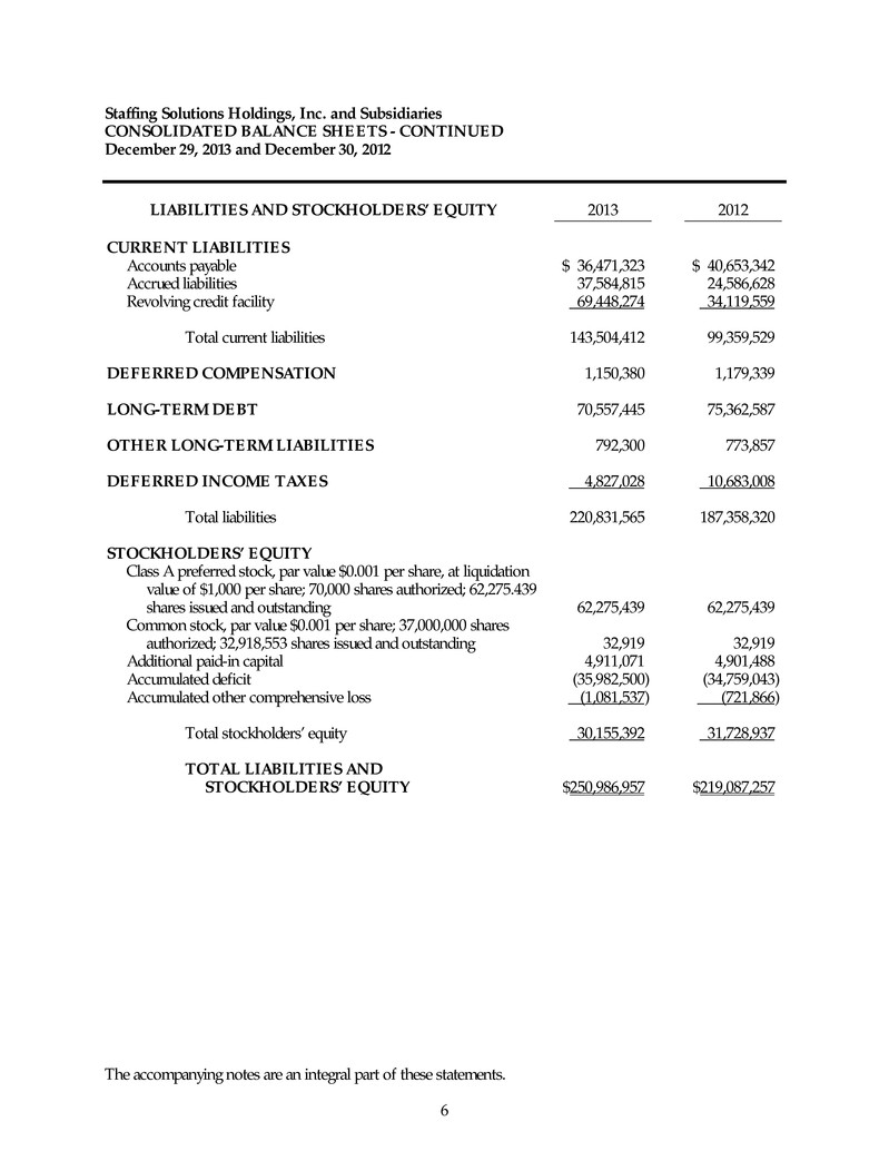 Staffing Solutions Holdings, Inc. and Subsidiaries CONSOLIDATED BALANCE SHEETS - CONTINUED December 29, 2013 and December 30, 2012 The accompanying notes are an integral part of these statements. 6 LIABILITIES AND STOCKHOLDERS’ EQUITY 2013 2012 CURRENT LIABILITIES Accounts payable $ 36,471,323 $ 40,653,342 Accrued liabilities 37,584,815 24,586,628 Revolving credit facility 69,448,274 34,119,559 Total current liabilities 143,504,412 99,359,529 DEFERRED COMPENSATION 1,150,380 1,179,339 LONG-TERM DEBT 70,557,445 75,362,587 OTHER LONG-TERM LIABILITIES 792,300 773,857 DEFERRED INCOME TAXES 4,827,028 10,683,008 Total liabilities 220,831,565 187,358,320 STOCKHOLDERS’ EQUITY Class A preferred stock, par value $0.001 per share, at liquidation value of $1,000 per share; 70,000 shares authorized; 62,275.439 shares issued and outstanding 62,275,439 62,275,439 Common stock, par value $0.001 per share; 37,000,000 shares authorized; 32,918,553 shares issued and outstanding 32,919 32,919 Additional paid-in capital 4,911,071 4,901,488 Accumulated deficit (35,982,500) (34,759,043) Accumulated other comprehensive loss (1,081,537) (721,866) Total stockholders’ equity 30,155,392 31,728,937 TOTAL LIABILITIES AND STOCKHOLDERS’ EQUITY $250,986,957 $219,087,257