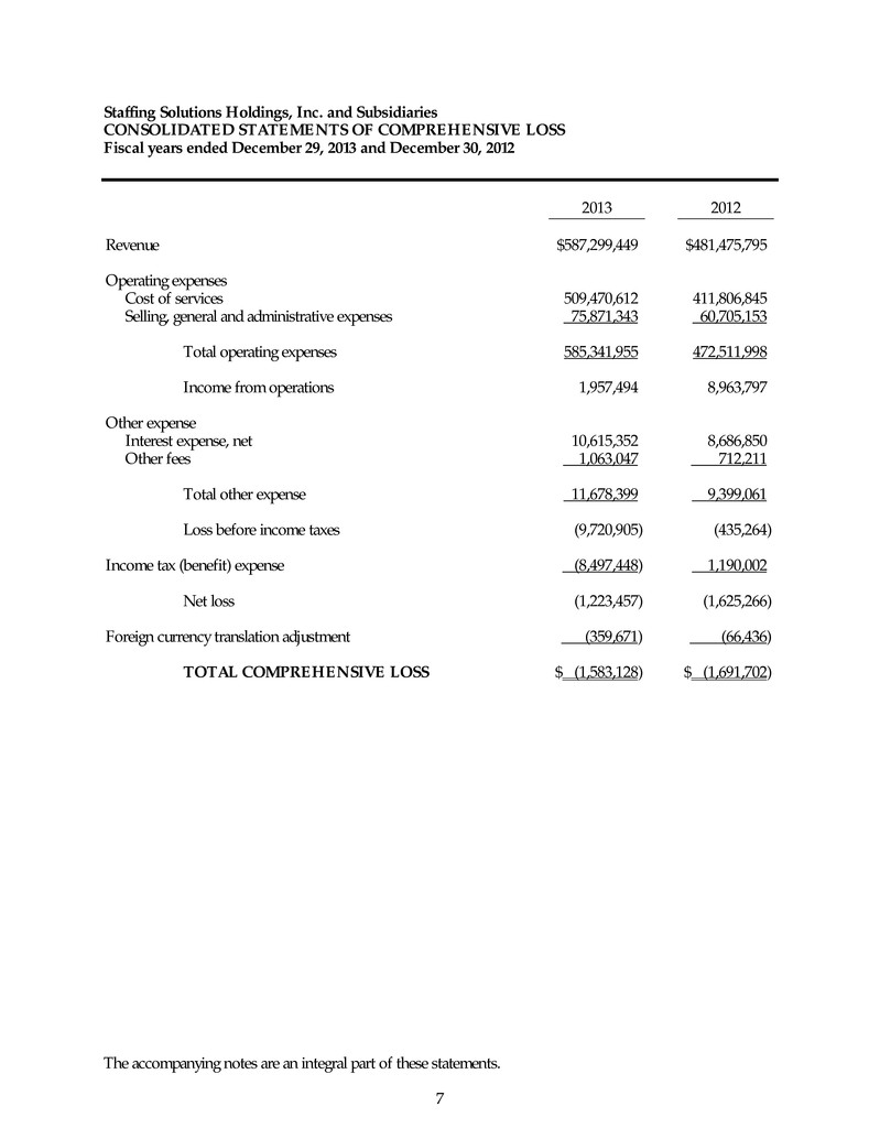 Staffing Solutions Holdings, Inc. and Subsidiaries CONSOLIDATED STATEMENTS OF COMPREHENSIVE LOSS Fiscal y ears ended December 29, 2013 and December 30, 2012 The accompanying notes are an integral part of these statements. 7 2013 2012 Revenue $587,299,449 $481,475,795 Operating expenses Cost of services 509,470,612 411,806,845 Selling, general and administrative expenses 75,871,343 60,705,153 Total operating expenses 585,341,955 472,511,998 Income from operations 1,957,494 8,963,797 Other expense Interest expense, net 10,615,352 8,686,850 Other fees 1,063,047 712,211 Total other expense 11,678,399 9,399,061 Loss before income taxes (9,720,905) (435,264) Income tax (benefit) expense (8,497,448) 1,190,002 Net loss (1,223,457) (1,625,266) Foreign currency translation adjustment (359,671) (66,436) TOTAL COMPREHENSIVE LOSS $ (1,583,128) $ (1,691,702)