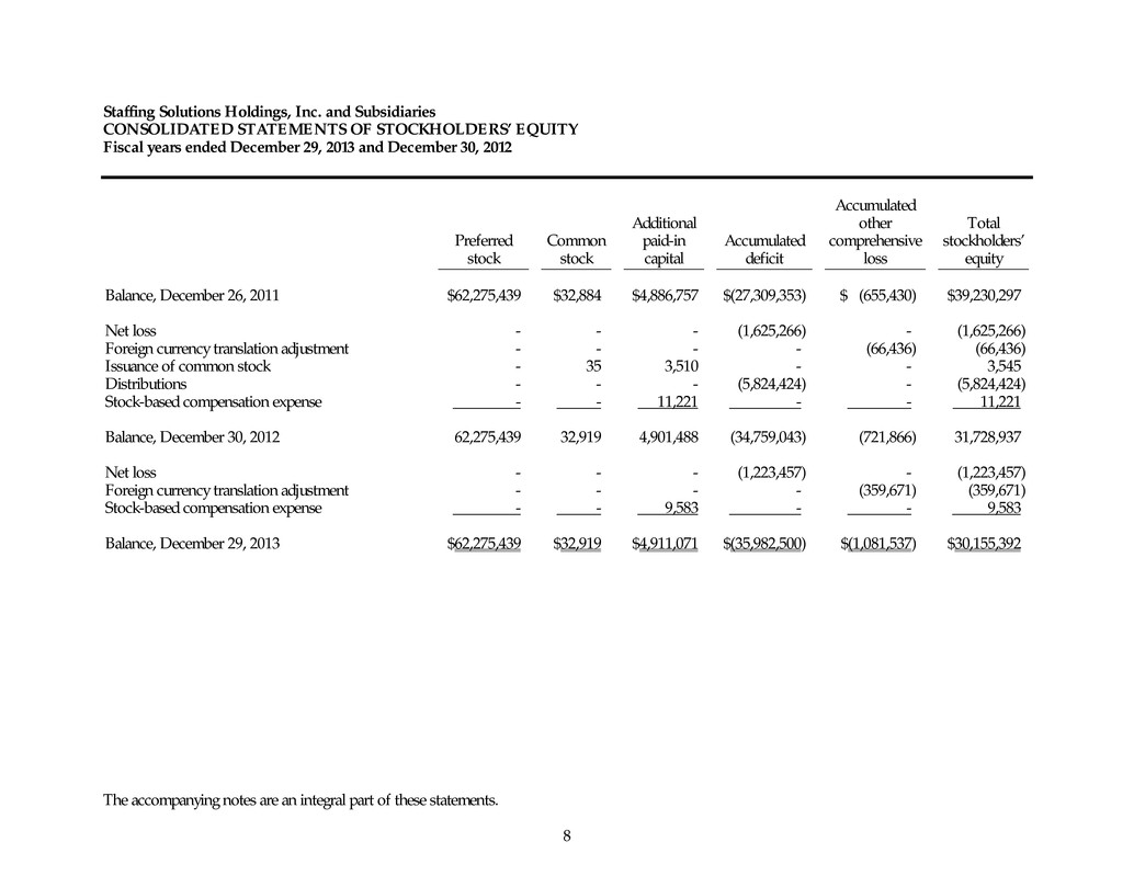 Staffing Solutions Holdings, Inc. and Subsidiaries CONSOLIDATED STATEMENTS OF STOCKHOLDERS’ EQUITY Fiscal years ended December 29, 2013 and December 30, 2012 The accompanying notes are an integral part of these statements. 8 Accumulated Additional other Total Preferred Common paid-in Accumulated comprehensive stockholders’ stock stock capital deficit loss equity Balance, December 26, 2011 $62,275,439 $32,884 $4,886,757 $(27,309,353) $ (655,430) $39,230,297 Net loss - - - (1,625,266) - (1,625,266) Foreign currency translation adjustment - - - - (66,436) (66,436) Issuance of common stock - 35 3,510 - - 3,545 Distributions - - - (5,824,424) - (5,824,424) Stock-based compensation expense - - 11,221 - - 11,221 Balance, December 30, 2012 62,275,439 32,919 4,901,488 (34,759,043) (721,866) 31,728,937 Net loss - - - (1,223,457) - (1,223,457) Foreign currency translation adjustment - - - - (359,671) (359,671) Stock-based compensation expense - - 9,583 - - 9,583 Balance, December 29, 2013 $62,275,439 $32,919 $4,911,071 $(35,982,500) $(1,081,537) $30,155,392