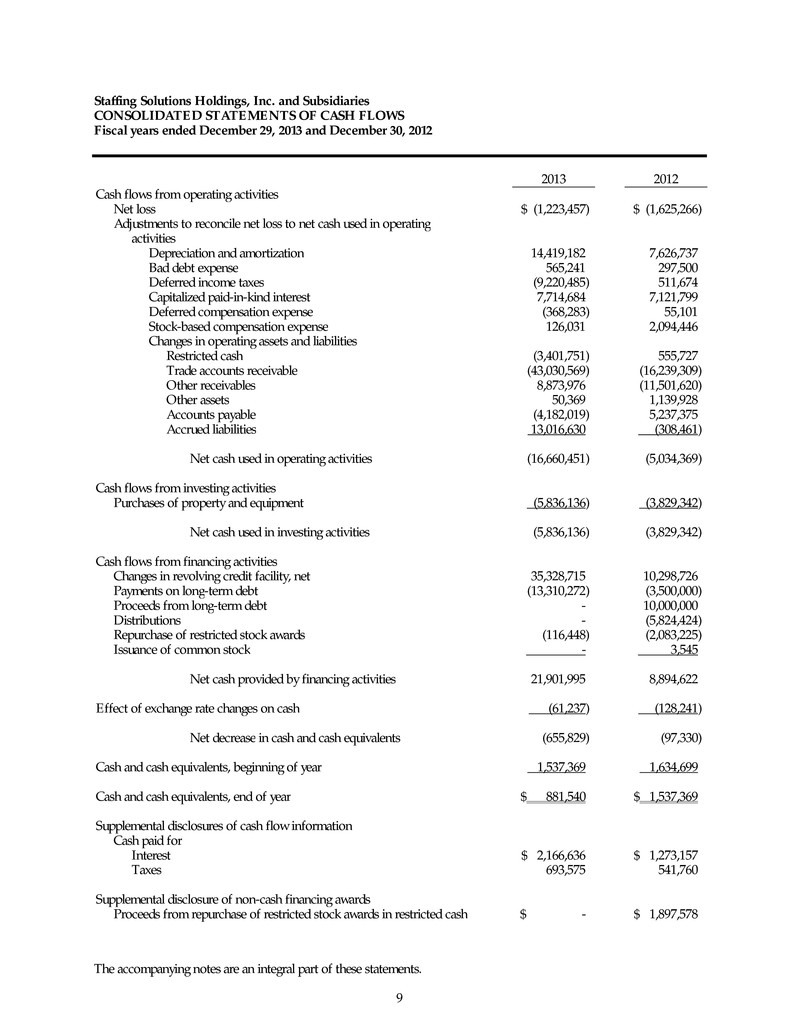 Staffing Solutions Holdings, Inc. and Subsidiaries CONSOLIDATED STATEMENTS OF CASH FLOWS Fiscal years ended December 29, 2013 and December 30, 2012 The accompanying notes are an integral part of these statements. 9 2013 2012 Cash flows from operating activities Net loss $ (1,223,457) $ (1,625,266) Adjustments to reconcile net loss to net cash used in operating activities Depreciation and amortization 14,419,182 7,626,737 Bad debt expense 565,241 297,500 Deferred income taxes (9,220,485) 511,674 Capitalized paid-in-kind interest 7,714,684 7,121,799 Deferred compensation expense (368,283) 55,101 Stock-based compensation expense 126,031 2,094,446 Changes in operating assets and liabilities Restricted cash (3,401,751) 555,727 Trade accounts receivable (43,030,569) (16,239,309) Other receivables 8,873,976 (11,501,620) Other assets 50,369 1,139,928 Accounts payable (4,182,019) 5,237,375 Accrued liabilities 13,016,630 (308,461) Net cash used in operating activities (16,660,451) (5,034,369) Cash flows from investing activities Purchases of property and equipment (5,836,136) (3,829,342) Net cash used in investing activities (5,836,136) (3,829,342) Cash flows from financing activities Changes in revolving credit facility, net 35,328,715 10,298,726 Payments on long-term debt (13,310,272) (3,500,000) Proceeds from long-term debt - 10,000,000 Distributions - (5,824,424) Repurchase of restricted stock awards (116,448) (2,083,225) Issuance of common stock - 3,545 Net cash provided by financing activities 21,901,995 8,894,622 Effect of exchange rate changes on cash (61,237) (128,241) Net decrease in cash and cash equivalents (655,829) (97,330) Cash and cash equivalents, beginning of year 1,537,369 1,634,699 Cash and cash equivalents, end of year $ 881,540 $ 1,537,369 Supplemental disclosures of cash flow information Cash paid for Interest $ 2,166,636 $ 1,273,157 Taxes 693,575 541,760 Supplemental disclosure of non-cash financing awards Proceeds from repurchase of restricted stock awards in restricted cash $ - $ 1,897,578