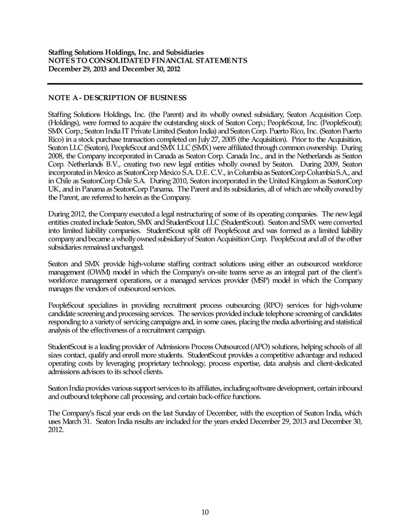 Staffing Solutions Holdings, Inc. and Subsidiaries NOTES TO CONSOLIDATED FINANCIAL STATEMENTS December 29, 2013 and December 30, 2012 10 NOTE A - DESCRIPTION OF BUSINESS Staffing Solutions Holdings, Inc. (the Parent) and its wholly owned subsidiary, Seaton Acquisition Corp. (Holdings), were formed to acquire the outstanding stock of Seaton Corp.; PeopleScout, Inc. (PeopleScout); SMX Corp.; Seaton India IT Private Limited (Seaton India) and Seaton Corp. Puerto Rico, Inc. (Seaton Puerto Rico) in a stock purchase transaction completed on July 27, 2005 (the Acquisition). Prior to the Acquisition, Seaton LLC (Seaton), PeopleScout and SMX LLC (SMX) were affiliated through common ownership. During 2008, the Company incorporated in Canada as Seaton Corp. Canada Inc., and in the Netherlands as Seaton Corp. Netherlands B.V., creating two new legal entities wholly owned by Seaton. During 2009, Seaton incorporated in Mexico as SeatonCorp Mexico S.A. D.E. C.V., in Columbia as SeatonCorp Columbia S.A., and in Chile as SeatonCorp Chile S.A. During 2010, Seaton incorporated in the United Kingdom as SeatonCorp UK, and in Panama as SeatonCorp Panama. The Parent and its subsidiaries, all of which are wholly owned by the Parent, are referred to herein as the Company. During 2012, the Company executed a legal restructuring of some of its operating companies. The new legal entities created include Seaton, SMX and StudentScout LLC (StudentScout). Seaton and SMX were converted into limited liability companies. StudentScout split off PeopleScout and was formed as a limited liability company and became a wholly owned subsidiary of Seaton Acquisition Corp. PeopleScout and all of the other subsidiaries remained unchanged. Seaton and SMX provide high-volume staffing contract solutions using either an outsourced workforce management (OWM) model in which the Company’s on-site teams serve as an integral part of the client’s workforce management operations, or a managed services provider (MSP) model in which the Company manages the vendors of outsourced services. PeopleScout specializes in providing recruitment process outsourcing (RPO) services for high-volume candidate screening and processing services. The services provided include telephone screening of candidates responding to a variety of servicing campaigns and, in some cases, placing the media advertising and statistical analysis of the effectiveness of a recruitment campaign. StudentScout is a leading provider of Admissions Process Outsourced (APO) solutions, helping schools of all sizes contact, qualify and enroll more students. StudentScout provides a competitive advantage and reduced operating costs by leveraging proprietary technology, process expertise, data analysis and client-dedicated admissions advisors to its school clients. Seaton India provides various support services to its affiliates, including software development, certain inbound and outbound telephone call processing, and certain back-office functions. The Company’s fiscal year ends on the last Sunday of December, with the exception of Seaton India, which uses March 31. Seaton India results are included for the years ended December 29, 2013 and December 30, 2012.