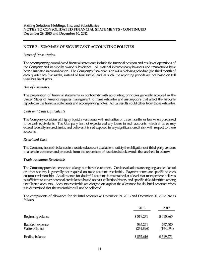 Staffing Solutions Holdings, Inc. and Subsidiaries NOTES TO CONSOLIDATED FINANCIAL STATEMENTS - CONTINUED December 29, 2013 and December 30, 2012 11 NOTE B - SUMMARY OF SIGNIFICANT ACCOUNTING POLICIES Basis of Presentation The accompanying consolidated financial statements include the financial position and results of operations of the Company and its wholly owned subsidiaries. All material intercompany balances and transactions have been eliminated in consolidation. The Company’s fiscal year is on a 4-4-5 closing schedule (the third month of each quarter has five weeks, instead of four weeks) and, as such, the reporting periods are not based on full years but fiscal years. Use of Estimates The preparation of financial statements in conformity with accounting principles generally accepted in the United States of America requires management to make estimates and assumptions that affect the amounts reported in the financial statements and accompanying notes. Actual results could differ from those estimates. Cash and Cash Equivalents The Company considers all highly liquid investments with maturities of three months or less when purchased to be cash equivalents. The Company has not experienced any losses in such accounts, which at times may exceed federally insured limits, and believes it is not exposed to any significant credit risk with respect to these accounts. Restricted Cash The Company has cash balances in a restricted account available to satisfy the obligations of third-party vendors to a certain customer and proceeds from the repurchase of restricted stock awards that are held in escrow. Trade Accounts Receivable The Company provides services to a large number of customers. Credit evaluations are ongoing, and collateral or other security is generally not required on trade accounts receivable. Payment terms are specific to each customer relationship. An allowance for doubtful accounts is maintained at a level that management believes is sufficient to cover potential credit losses based on past collection history and specific risks identified among uncollected accounts. Accounts receivable are charged off against the allowance for doubtful accounts when it is determined that the receivables will not be collected. The components of allowance for doubtful accounts at December 29, 2013 and December 30, 2012, are as follows: 2013 2012 Beginning balance $ 519,271 $ 415,865 Bad debt expense 565,241 297,500 Write-offs, net (231,896) (194,094) Ending balance $ 852,616 $ 519,271