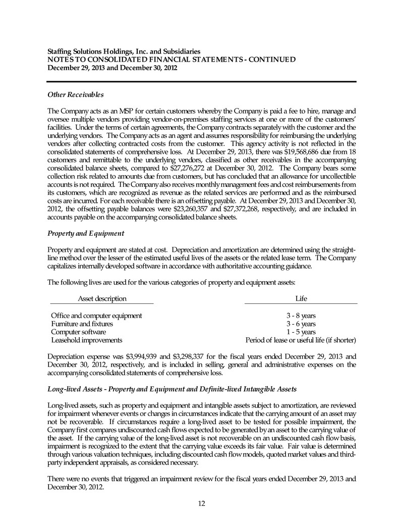Staffing Solutions Holdings, Inc. and Subsidiaries NOTES TO CONSOLIDATED FINANCIAL STATEMENTS - CONTINUED December 29, 2013 and December 30, 2012 12 Other Receivables The Company acts as an MSP for certain customers whereby the Company is paid a fee to hire, manage and oversee multiple vendors providing vendor-on-premises staffing services at one or more of the customers’ facilities. Under the terms of certain agreements, the Company contracts separately with the customer and the underlying vendors. The Company acts as an agent and assumes responsibility for reimbursing the underlying vendors after collecting contracted costs from the customer. This agency activity is not reflected in the consolidated statements of comprehensive loss. At December 29, 2013, there was $19,568,686 due from 18 customers and remittable to the underlying vendors, classified as other receivables in the accompanying consolidated balance sheets, compared to $27,276,272 at December 30, 2012. The Company bears some collection risk related to amounts due from customers, but has concluded that an allowance for uncollectible accounts is not required. The Company also receives monthly management fees and cost reimbursements from its customers, which are recognized as revenue as the related services are performed and as the reimbursed costs are incurred. For each receivable there is an offsetting payable. At December 29, 2013 and December 30, 2012, the offsetting payable balances were $23,260,357 and $27,372,268, respectively, and are included in accounts payable on the accompanying consolidated balance sheets. Property and Equipment Property and equipment are stated at cost. Depreciation and amortization are determined using the straight- line method over the lesser of the estimated useful lives of the assets or the related lease term. The Company capitalizes internally developed software in accordance with authoritative accounting guidance. The following lives are used for the various categories of property and equipment assets: Asset description Life Office and computer equipment 3 - 8 years Furniture and fixtures 3 - 6 years Computer software 1 - 5 years Leasehold improvements Period of lease or useful life (if shorter) Depreciation expense was $3,994,939 and $3,298,337 for the fiscal years ended December 29, 2013 and December 30, 2012, respectively, and is included in selling, general and administrative expenses on the accompanying consolidated statements of comprehensive loss. Long-lived Assets - Property and Equipment and Definite-lived Intangible Assets Long-lived assets, such as property and equipment and intangible assets subject to amortization, are reviewed for impairment whenever events or changes in circumstances indicate that the carrying amount of an asset may not be recoverable. If circumstances require a long-lived asset to be tested for possible impairment, the Company first compares undiscounted cash flows expected to be generated by an asset to the carrying value of the asset. If the carrying value of the long-lived asset is not recoverable on an undiscounted cash flow basis, impairment is recognized to the extent that the carrying value exceeds its fair value. Fair value is determined through various valuation techniques, including discounted cash flow models, quoted market values and third- party independent appraisals, as considered necessary. There were no events that triggered an impairment review for the fiscal years ended December 29, 2013 and December 30, 2012.