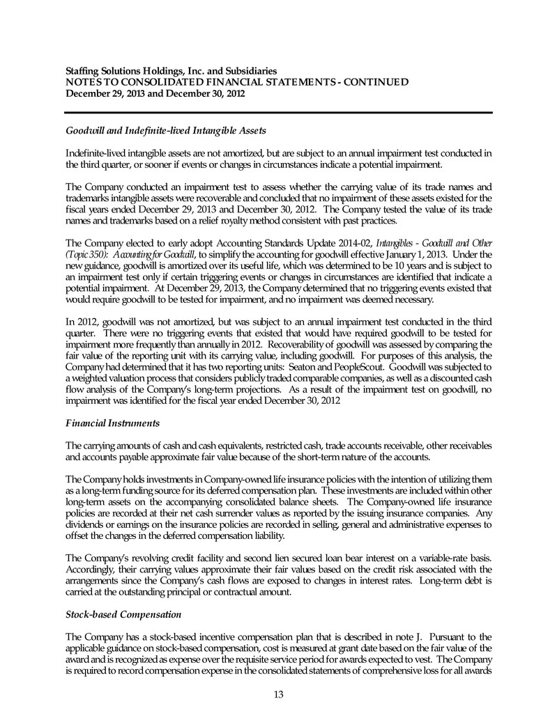 Staffing Solutions Holdings, Inc. and Subsidiaries NOTES TO CONSOLIDATED FINANCIAL STATEMENTS - CONTINUED December 29, 2013 and December 30, 2012 13 Goodwill and Indefinite-lived Intangible Assets Indefinite-lived intangible assets are not amortized, but are subject to an annual impairment test conducted in the third quarter, or sooner if events or changes in circumstances indicate a potential impairment. The Company conducted an impairment test to assess whether the carrying value of its trade names and trademarks intangible assets were recoverable and concluded that no impairment of these assets existed for the fiscal years ended December 29, 2013 and December 30, 2012. The Company tested the value of its trade names and trademarks based on a relief royalty method consistent with past practices. The Company elected to early adopt Accounting Standards Update 2014-02, Intangibles - Goodwill and Other (Topic 350): Accounting for Goodwill, to simplify the accounting for goodwill effective January 1, 2013. Under the new guidance, goodwill is amortized over its useful life, which was determined to be 10 years and is subject to an impairment test only if certain triggering events or changes in circumstances are identified that indicate a potential impairment. At December 29, 2013, the Company determined that no triggering events existed that would require goodwill to be tested for impairment, and no impairment was deemed necessary. In 2012, goodwill was not amortized, but was subject to an annual impairment test conducted in the third quarter. There were no triggering events that existed that would have required goodwill to be tested for impairment more frequently than annually in 2012. Recoverability of goodwill was assessed by comparing the fair value of the reporting unit with its carrying value, including goodwill. For purposes of this analysis, the Company had determined that it has two reporting units: Seaton and PeopleScout. Goodwill was subjected to a weighted valuation process that considers publicly traded comparable companies, as well as a discounted cash flow analysis of the Company’s long-term projections. As a result of the impairment test on goodwill, no impairment was identified for the fiscal year ended December 30, 2012 Financial Instruments The carrying amounts of cash and cash equivalents, restricted cash, trade accounts receivable, other receivables and accounts payable approximate fair value because of the short-term nature of the accounts. The Company holds investments in Company-owned life insurance policies with the intention of utilizing them as a long-term funding source for its deferred compensation plan. These investments are included within other long-term assets on the accompanying consolidated balance sheets. The Company-owned life insurance policies are recorded at their net cash surrender values as reported by the issuing insurance companies. Any dividends or earnings on the insurance policies are recorded in selling, general and administrative expenses to offset the changes in the deferred compensation liability. The Company’s revolving credit facility and second lien secured loan bear interest on a variable-rate basis. Accordingly, their carrying values approximate their fair values based on the credit risk associated with the arrangements since the Company’s cash flows are exposed to changes in interest rates. Long-term debt is carried at the outstanding principal or contractual amount. Stock-based Compensation The Company has a stock-based incentive compensation plan that is described in note J. Pursuant to the applicable guidance on stock-based compensation, cost is measured at grant date based on the fair value of the award and is recognized as expense over the requisite service period for awards expected to vest. The Company is required to record compensation expense in the consolidated statements of comprehensive loss for all awards