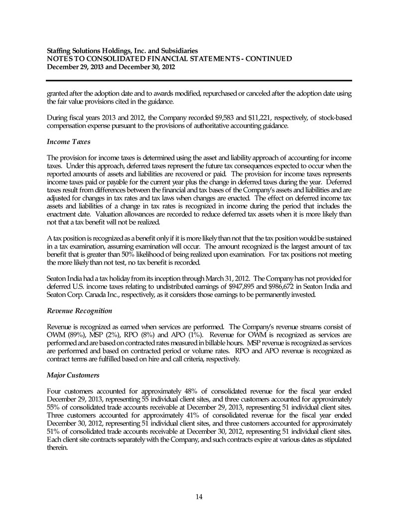 Staffing Solutions Holdings, Inc. and Subsidiaries NOTES TO CONSOLIDATED FINANCIAL STATEMENTS - CONTINUED December 29, 2013 and December 30, 2012 14 granted after the adoption date and to awards modified, repurchased or canceled after the adoption date using the fair value provisions cited in the guidance. During fiscal years 2013 and 2012, the Company recorded $9,583 and $11,221, respectively, of stock-based compensation expense pursuant to the provisions of authoritative accounting guidance. Income Taxes The provision for income taxes is determined using the asset and liability approach of accounting for income taxes. Under this approach, deferred taxes represent the future tax consequences expected to occur when the reported amounts of assets and liabilities are recovered or paid. The provision for income taxes represents income taxes paid or payable for the current year plus the change in deferred taxes during the year. Deferred taxes result from differences between the financial and tax bases of the Company’s assets and liabilities and are adjusted for changes in tax rates and tax laws when changes are enacted. The effect on deferred income tax assets and liabilities of a change in tax rates is recognized in income during the period that includes the enactment date. Valuation allowances are recorded to reduce deferred tax assets when it is more likely than not that a tax benefit will not be realized. A tax position is recognized as a benefit only if it is more likely than not that the tax position would be sustained in a tax examination, assuming examination will occur. The amount recognized is the largest amount of tax benefit that is greater than 50% likelihood of being realized upon examination. For tax positions not meeting the more likely than not test, no tax benefit is recorded. Seaton India had a tax holiday from its inception through March 31, 2012. The Company has not provided for deferred U.S. income taxes relating to undistributed earnings of $947,895 and $986,672 in Seaton India and Seaton Corp. Canada Inc., respectively, as it considers those earnings to be permanently invested. Revenue Recognition Revenue is recognized as earned when services are performed. The Company’s revenue streams consist of OWM (89%), MSP (2%), RPO (8%) and APO (1%). Revenue for OWM is recognized as services are performed and are based on contracted rates measured in billable hours. MSP revenue is recognized as services are performed and based on contracted period or volume rates. RPO and APO revenue is recognized as contract terms are fulfilled based on hire and call criteria, respectively. Major Customers Four customers accounted for approximately 48% of consolidated revenue for the fiscal year ended December 29, 2013, representing 55 individual client sites, and three customers accounted for approximately 55% of consolidated trade accounts receivable at December 29, 2013, representing 51 individual client sites. Three customers accounted for approximately 41% of consolidated revenue for the fiscal year ended December 30, 2012, representing 51 individual client sites, and three customers accounted for approximately 51% of consolidated trade accounts receivable at December 30, 2012, representing 51 individual client sites. Each client site contracts separately with the Company, and such contracts expire at various dates as stipulated therein.