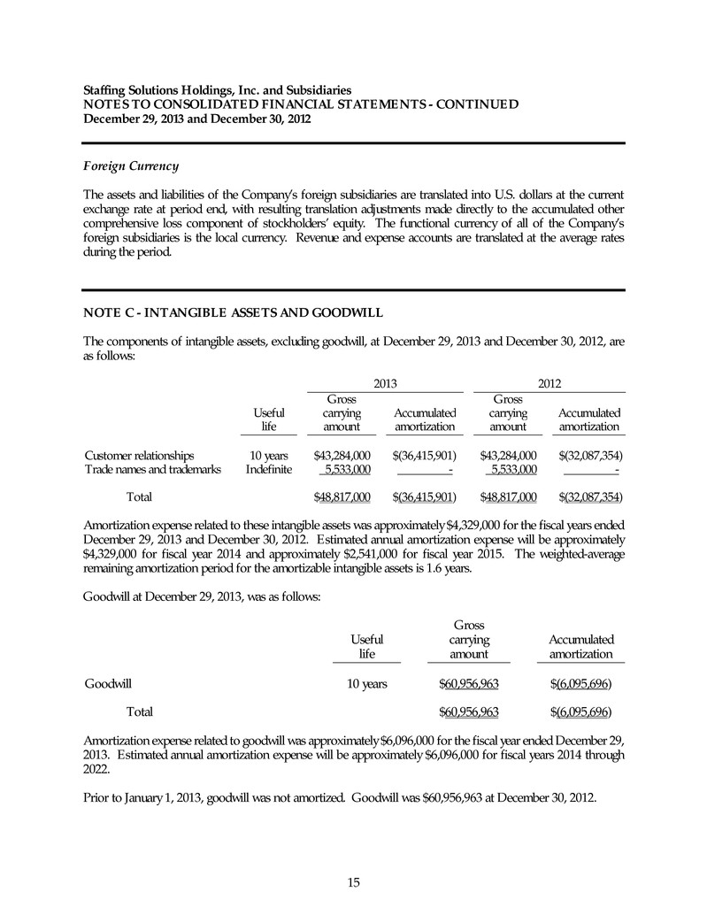 Staffing Solutions Holdings, Inc. and Subsidiaries NOTES TO CONSOLIDATED FINANCIAL STATEMENTS - CONTINUED December 29, 2013 and December 30, 2012 15 Foreign Currency The assets and liabilities of the Company’s foreign subsidiaries are translated into U.S. dollars at the current exchange rate at period end, with resulting translation adjustments made directly to the accumulated other comprehensive loss component of stockholders’ equity. The functional currency of all of the Company’s foreign subsidiaries is the local currency. Revenue and expense accounts are translated at the average rates during the period. NOTE C - INTANGIBLE ASSETS AND GOODWILL The components of intangible assets, excluding goodwill, at December 29, 2013 and December 30, 2012, are as follows: 2013 2012 Gross Gross Useful carrying Accumulated carrying Accumulated life amount amortization amount amortization Customer relationships 10 years $43,284,000 $(36,415,901) $43,284,000 $(32,087,354) Trade names and trademarks Indefinite 5,533,000 - 5,533,000 - Total $48,817,000 $(36,415,901) $48,817,000 $(32,087,354) Amortization expense related to these intangible assets was approximately $4,329,000 for the fiscal years ended December 29, 2013 and December 30, 2012. Estimated annual amortization expense will be approximately $4,329,000 for fiscal year 2014 and approximately $2,541,000 for fiscal year 2015. The weighted-average remaining amortization period for the amortizable intangible assets is 1.6 years. Goodwill at December 29, 2013, was as follows: Gross Useful carrying Accumulated life amount amortization Goodwill 10 years $60,956,963 $(6,095,696) Total $60,956,963 $(6,095,696) Amortization expense related to goodwill was approximately $6,096,000 for the fiscal year ended December 29, 2013. Estimated annual amortization expense will be approximately $6,096,000 for fiscal years 2014 through 2022. Prior to January 1, 2013, goodwill was not amortized. Goodwill was $60,956,963 at December 30, 2012.