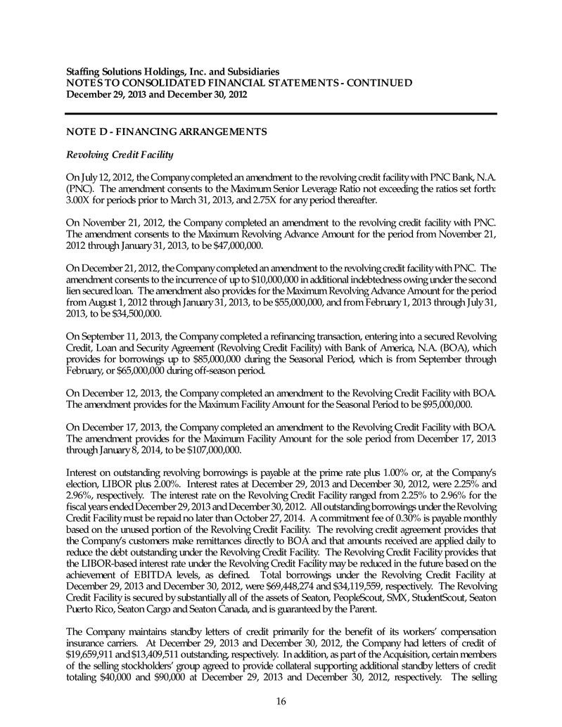 Staffing Solutions Holdings, Inc. and Subsidiaries NOTES TO CONSOLIDATED FINANCIAL STATEMENTS - CONTINUED December 29, 2013 and December 30, 2012 16 NOTE D - FINANCING ARRANGEMENTS Revolving Credit Facility On July 12, 2012, the Company completed an amendment to the revolving credit facility with PNC Bank, N.A. (PNC). The amendment consents to the Maximum Senior Leverage Ratio not exceeding the ratios set forth: 3.00X for periods prior to March 31, 2013, and 2.75X for any period thereafter. On November 21, 2012, the Company completed an amendment to the revolving credit facility with PNC. The amendment consents to the Maximum Revolving Advance Amount for the period from November 21, 2012 through January 31, 2013, to be $47,000,000. On December 21, 2012, the Company completed an amendment to the revolving credit facility with PNC. The amendment consents to the incurrence of up to $10,000,000 in additional indebtedness owing under the second lien secured loan. The amendment also provides for the Maximum Revolving Advance Amount for the period from August 1, 2012 through January 31, 2013, to be $55,000,000, and from February 1, 2013 through July 31, 2013, to be $34,500,000. On September 11, 2013, the Company completed a refinancing transaction, entering into a secured Revolving Credit, Loan and Security Agreement (Revolving Credit Facility) with Bank of America, N.A. (BOA), which provides for borrowings up to $85,000,000 during the Seasonal Period, which is from September through February, or $65,000,000 during off-season period. On December 12, 2013, the Company completed an amendment to the Revolving Credit Facility with BOA. The amendment provides for the Maximum Facility Amount for the Seasonal Period to be $95,000,000. On December 17, 2013, the Company completed an amendment to the Revolving Credit Facility with BOA. The amendment provides for the Maximum Facility Amount for the sole period from December 17, 2013 through January 8, 2014, to be $107,000,000. Interest on outstanding revolving borrowings is payable at the prime rate plus 1.00% or, at the Company’s election, LIBOR plus 2.00%. Interest rates at December 29, 2013 and December 30, 2012, were 2.25% and 2.96%, respectively. The interest rate on the Revolving Credit Facility ranged from 2.25% to 2.96% for the fiscal years ended December 29, 2013 and December 30, 2012. All outstanding borrowings under the Revolving Credit Facility must be repaid no later than October 27, 2014. A commitment fee of 0.30% is payable monthly based on the unused portion of the Revolving Credit Facility. The revolving credit agreement provides that the Company’s customers make remittances directly to BOA and that amounts received are applied daily to reduce the debt outstanding under the Revolving Credit Facility. The Revolving Credit Facility provides that the LIBOR-based interest rate under the Revolving Credit Facility may be reduced in the future based on the achievement of EBITDA levels, as defined. Total borrowings under the Revolving Credit Facility at December 29, 2013 and December 30, 2012, were $69,448,274 and $34,119,559, respectively. The Revolving Credit Facility is secured by substantially all of the assets of Seaton, PeopleScout, SMX, StudentScout, Seaton Puerto Rico, Seaton Cargo and Seaton Canada, and is guaranteed by the Parent. The Company maintains standby letters of credit primarily for the benefit of its workers’ compensation insurance carriers. At December 29, 2013 and December 30, 2012, the Company had letters of credit of $19,659,911 and $13,409,511 outstanding, respectively. In addition, as part of the Acquisition, certain members of the selling stockholders’ group agreed to provide collateral supporting additional standby letters of credit totaling $40,000 and $90,000 at December 29, 2013 and December 30, 2012, respectively. The selling