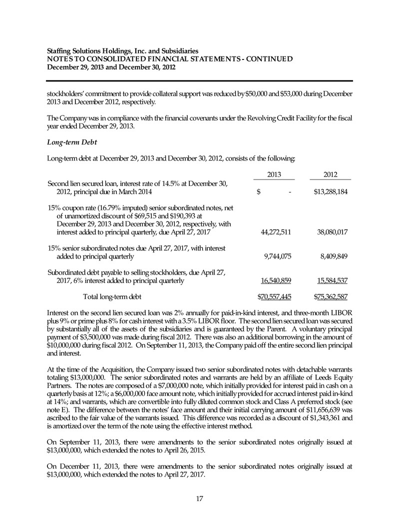 Staffing Solutions Holdings, Inc. and Subsidiaries NOTES TO CONSOLIDATED FINANCIAL STATEMENTS - CONTINUED December 29, 2013 and December 30, 2012 17 stockholders’ commitment to provide collateral support was reduced by $50,000 and $53,000 during December 2013 and December 2012, respectively. The Company was in compliance with the financial covenants under the Revolving Credit Facility for the fiscal year ended December 29, 2013. Long-term Debt Long-term debt at December 29, 2013 and December 30, 2012, consists of the following: 2013 2012 Second lien secured loan, interest rate of 14.5% at December 30, 2012, principal due in March 2014 $ - $13,288,184 15% coupon rate (16.79% imputed) senior subordinated notes, net of unamortized discount of $69,515 and $190,393 at December 29, 2013 and December 30, 2012, respectively, with interest added to principal quarterly, due April 27, 2017 44,272,511 38,080,017 15% senior subordinated notes due April 27, 2017, with interest added to principal quarterly 9,744,075 8,409,849 Subordinated debt payable to selling stockholders, due April 27, 2017, 6% interest added to principal quarterly 16,540,859 15,584,537 Total long-term debt $70,557,445 $75,362,587 Interest on the second lien secured loan was 2% annually for paid-in-kind interest, and three-month LIBOR plus 9% or prime plus 8% for cash interest with a 3.5% LIBOR floor. The second lien secured loan was secured by substantially all of the assets of the subsidiaries and is guaranteed by the Parent. A voluntary principal payment of $3,500,000 was made during fiscal 2012. There was also an additional borrowing in the amount of $10,000,000 during fiscal 2012. On September 11, 2013, the Company paid off the entire second lien principal and interest. At the time of the Acquisition, the Company issued two senior subordinated notes with detachable warrants totaling $13,000,000. The senior subordinated notes and warrants are held by an affiliate of Leeds Equity Partners. The notes are composed of a $7,000,000 note, which initially provided for interest paid in cash on a quarterly basis at 12%; a $6,000,000 face amount note, which initially provided for accrued interest paid in-kind at 14%; and warrants, which are convertible into fully diluted common stock and Class A preferred stock (see note E). The difference between the notes’ face amount and their initial carrying amount of $11,656,639 was ascribed to the fair value of the warrants issued. This difference was recorded as a discount of $1,343,361 and is amortized over the term of the note using the effective interest method. On September 11, 2013, there were amendments to the senior subordinated notes originally issued at $13,000,000, which extended the notes to April 26, 2015. On December 11, 2013, there were amendments to the senior subordinated notes originally issued at $13,000,000, which extended the notes to April 27, 2017.
