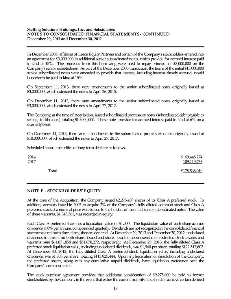 Staffing Solutions Holdings, Inc. and Subsidiaries NOTES TO CONSOLIDATED FINANCIAL STATEMENTS - CONTINUED December 29, 2013 and December 30, 2012 18 In December 2005, affiliates of Leeds Equity Partners and certain of the Company’s stockholders entered into an agreement for $3,000,000 in additional senior subordinated notes, which provide for accrued interest paid in-kind at 15%. The proceeds from this borrowing were used to repay principal of $3,000,000 on the Company’s senior indebtedness. As part of the December 2005 transaction, the terms of the initial $13,000,000 senior subordinated notes were amended to provide that interest, including interest already accrued, would henceforth be paid in-kind at 15%. On September 11, 2013, there were amendments to the senior subordinated notes originally issued at $3,000,000, which extended the notes to April 26, 2015. On December 11, 2013, there were amendments to the senior subordinated notes originally issued at $3,000,000, which extended the notes to April 27, 2017. The Company, at the time of Acquisition, issued subordinated promissory notes (subordinated debt payable to selling stockholders) totaling $10,000,000. These notes provide for accrued interest paid in-kind at 6% on a quarterly basis. On December 11, 2013, there were amendments to the subordinated promissory notes originally issued at $10,000,000, which extended the notes to April 27, 2017. Scheduled annual maturities of long-term debt are as follows: 2014 $ 69,448,274 2017 109,119,736 Total $178,568,010 NOTE E - STOCKHOLDERS’ EQUITY At the time of the Acquisition, the Company issued 62,275.439 shares of its Class A preferred stock. In addition, warrants issued in 2005 to acquire 2% of the Company’s fully diluted common stock and Class A preferred stock at a nominal price were issued to the holders of the initial senior subordinated notes. The value of these warrants, $1,343,361, was recorded in equity. Each Class A preferred share has a liquidation value of $1,000. The liquidation value of each share accrues dividends at 8% per annum, compounded quarterly. Dividends are not recognized in the consolidated financial statements until such time, if any, they are declared. At December 29, 2013 and December 30, 2012, undeclared dividends in arrears on both shares issued and shares issuable upon exercise of restricted stock awards and warrants were $61,071,858 and $51,678,272, respectively. At December 29, 2013, the fully diluted Class A preferred stock liquidation value, including undeclared dividends, was $1,960 per share, totaling $122,517,602. At December 30, 2012, the fully diluted Class A preferred stock liquidation value, including undeclared dividends, was $1,803 per share, totaling $113,825,444. Upon any liquidation or dissolution of the Company, the preferred shares, along with any cumulative unpaid dividends, have liquidation preference over the Company’s common stock. The stock purchase agreement provides that additional consideration of $9,275,000 be paid to former stockholders by the Company in the event that either the current majority stockholders achieve certain defined