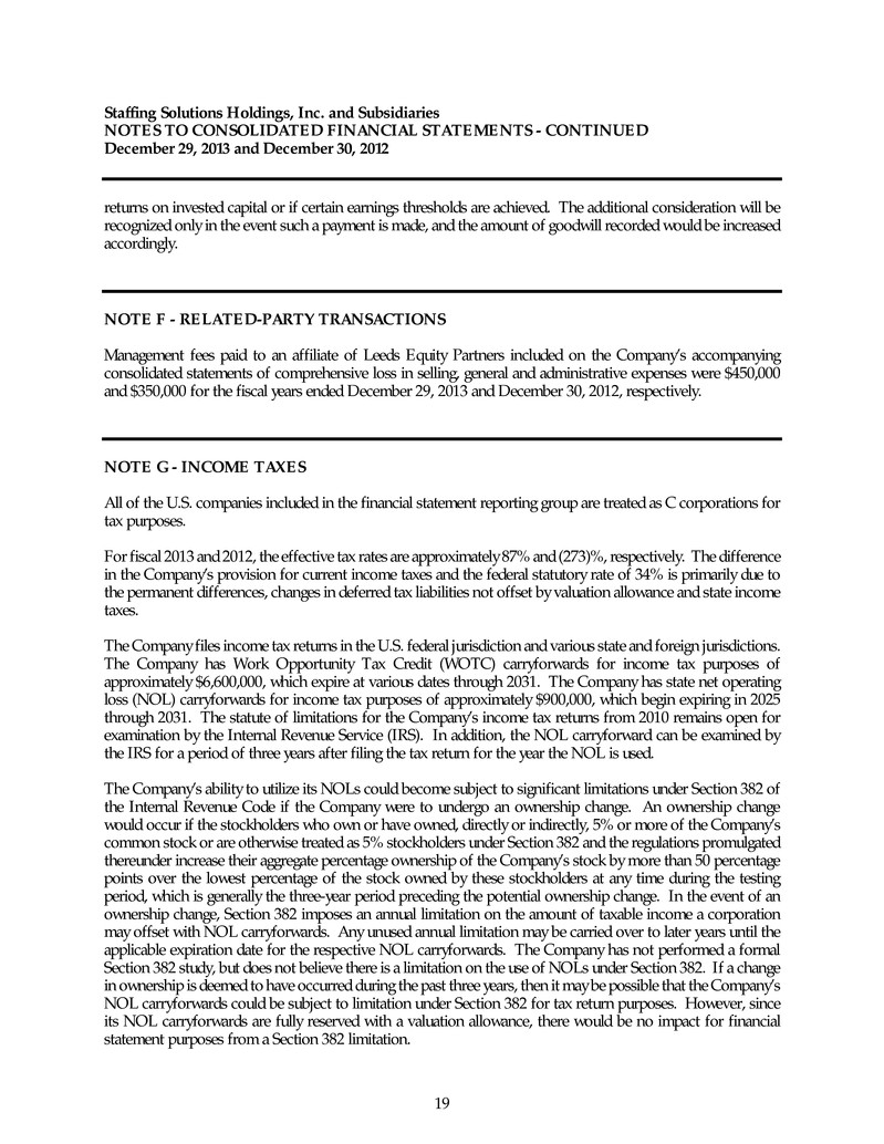 Staffing Solutions Holdings, Inc. and Subsidiaries NOTES TO CONSOLIDATED FINANCIAL STATEMENTS - CONTINUED December 29, 2013 and December 30, 2012 19 returns on invested capital or if certain earnings thresholds are achieved. The additional consideration will be recognized only in the event such a payment is made, and the amount of goodwill recorded would be increased accordingly. NOTE F - RELATED-PARTY TRANSACTIONS Management fees paid to an affiliate of Leeds Equity Partners included on the Company’s accompanying consolidated statements of comprehensive loss in selling, general and administrative expenses were $450,000 and $350,000 for the fiscal years ended December 29, 2013 and December 30, 2012, respectively. NOTE G - INCOME TAXES All of the U.S. companies included in the financial statement reporting group are treated as C corporations for tax purposes. For fiscal 2013 and 2012, the effective tax rates are approximately 87% and (273)%, respectively. The difference in the Company’s provision for current income taxes and the federal statutory rate of 34% is primarily due to the permanent differences, changes in deferred tax liabilities not offset by valuation allowance and state income taxes. The Company files income tax returns in the U.S. federal jurisdiction and various state and foreign jurisdictions. The Company has Work Opportunity Tax Credit (WOTC) carryforwards for income tax purposes of approximately $6,600,000, which expire at various dates through 2031. The Company has state net operating loss (NOL) carryforwards for income tax purposes of approximately $900,000, which begin expiring in 2025 through 2031. The statute of limitations for the Company’s income tax returns from 2010 remains open for examination by the Internal Revenue Service (IRS). In addition, the NOL carryforward can be examined by the IRS for a period of three years after filing the tax return for the year the NOL is used. The Company’s ability to utilize its NOLs could become subject to significant limitations under Section 382 of the Internal Revenue Code if the Company were to undergo an ownership change. An ownership change would occur if the stockholders who own or have owned, directly or indirectly, 5% or more of the Company’s common stock or are otherwise treated as 5% stockholders under Section 382 and the regulations promulgated thereunder increase their aggregate percentage ownership of the Company’s stock by more than 50 percentage points over the lowest percentage of the stock owned by these stockholders at any time during the testing period, which is generally the three-year period preceding the potential ownership change. In the event of an ownership change, Section 382 imposes an annual limitation on the amount of taxable income a corporation may offset with NOL carryforwards. Any unused annual limitation may be carried over to later years until the applicable expiration date for the respective NOL carryforwards. The Company has not performed a formal Section 382 study, but does not believe there is a limitation on the use of NOLs under Section 382. If a change in ownership is deemed to have occurred during the past three years, then it may be possible that the Company’s NOL carryforwards could be subject to limitation under Section 382 for tax return purposes. However, since its NOL carryforwards are fully reserved with a valuation allowance, there would be no impact for financial statement purposes from a Section 382 limitation.
