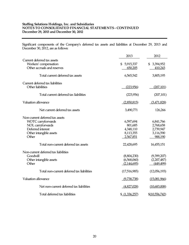 Staffing Solutions Holdings, Inc. and Subsidiaries NOTES TO CONSOLIDATED FINANCIAL STATEMENTS - CONTINUED December 29, 2013 and December 30, 2012 20 Significant components of the Company’s deferred tax assets and liabilities at December 29, 2013 and December 30, 2012, are as follows: 2013 2012 Current deferred tax assets Workers’ compensation $ 5,915,337 $ 3,394,952 Other accruals and reserves 650,205 410,243 Total current deferred tax assets 6,565,542 3,805,195 Current deferred tax liabilities Other liabilities (223,956) (207,101) Total current deferred tax liabilities (223,956) (207,101) Valuation allowance (2,850,815) (3,471,828) Net current deferred tax assets 3,490,771 126,266 Non-current deferred tax assets WOTC carryforwards 6,597,694 6,841,766 NOL carryforwards 801,685 2,768,658 Deferred interest 4,348,110 2,739,947 Other intangible assets 8,113,355 3,116,590 Other 2,567,851 988,190 Total non-current deferred tax assets 22,428,695 16,455,151 Non-current deferred tax liabilities Goodwill (8,804,230) (9,399,207) Other intangible assets (6,568,060) (2,207,487) Other (2,144,695) (449,499) Total non-current deferred tax liabilities (17,516,985) (12,056,193) Valuation allowance (9,738,738) (15,081,966) Net non-current deferred tax liabilities (4,827,028) (10,683,008) Total deferred tax liabilities $ (1,336,257) $(10,556,742)