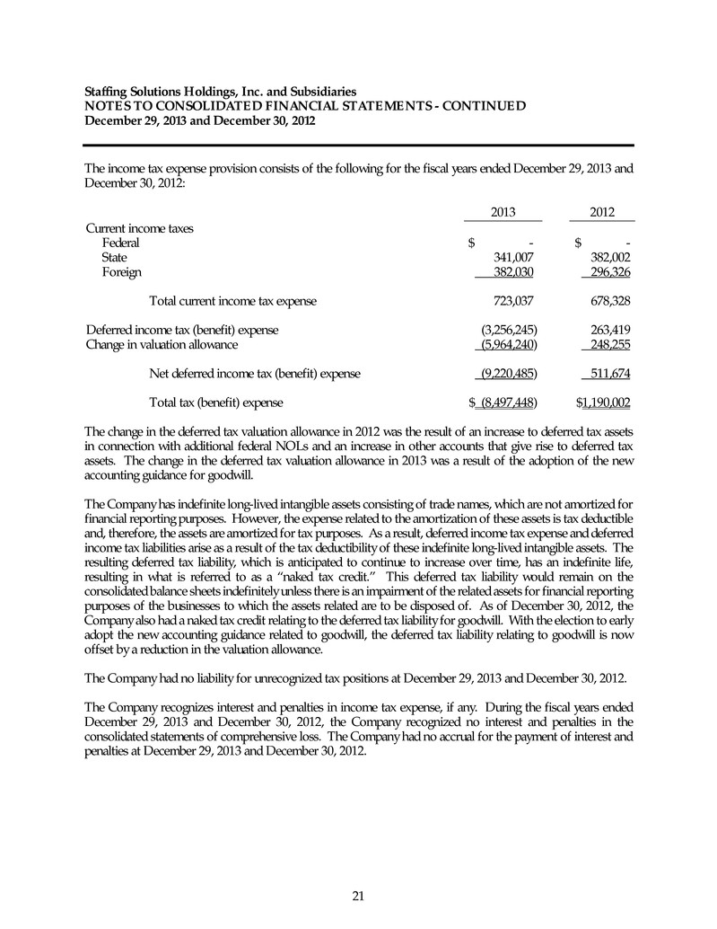 Staffing Solutions Holdings, Inc. and Subsidiaries NOTES TO CONSOLIDATED FINANCIAL STATEMENTS - CONTINUED December 29, 2013 and December 30, 2012 21 The income tax expense provision consists of the following for the fiscal years ended December 29, 2013 and December 30, 2012: 2013 2012 Current income taxes Federal $ - $ - State 341,007 382,002 Foreign 382,030 296,326 Total current income tax expense 723,037 678,328 Deferred income tax (benefit) expense (3,256,245) 263,419 Change in valuation allowance (5,964,240) 248,255 Net deferred income tax (benefit) expense (9,220,485) 511,674 Total tax (benefit) expense $ (8,497,448) $1,190,002 The change in the deferred tax valuation allowance in 2012 was the result of an increase to deferred tax assets in connection with additional federal NOLs and an increase in other accounts that give rise to deferred tax assets. The change in the deferred tax valuation allowance in 2013 was a result of the adoption of the new accounting guidance for goodwill. The Company has indefinite long-lived intangible assets consisting of trade names, which are not amortized for financial reporting purposes. However, the expense related to the amortization of these assets is tax deductible and, therefore, the assets are amortized for tax purposes. As a result, deferred income tax expense and deferred income tax liabilities arise as a result of the tax deductibility of these indefinite long-lived intangible assets. The resulting deferred tax liability, which is anticipated to continue to increase over time, has an indefinite life, resulting in what is referred to as a “naked tax credit.” This deferred tax liability would remain on the consolidated balance sheets indefinitely unless there is an impairment of the related assets for financial reporting purposes of the businesses to which the assets related are to be disposed of. As of December 30, 2012, the Company also had a naked tax credit relating to the deferred tax liability for goodwill. With the election to early adopt the new accounting guidance related to goodwill, the deferred tax liability relating to goodwill is now offset by a reduction in the valuation allowance. The Company had no liability for unrecognized tax positions at December 29, 2013 and December 30, 2012. The Company recognizes interest and penalties in income tax expense, if any. During the fiscal years ended December 29, 2013 and December 30, 2012, the Company recognized no interest and penalties in the consolidated statements of comprehensive loss. The Company had no accrual for the payment of interest and penalties at December 29, 2013 and December 30, 2012.