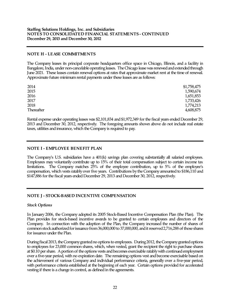 Staffing Solutions Holdings, Inc. and Subsidiaries NOTES TO CONSOLIDATED FINANCIAL STATEMENTS - CONTINUED December 29, 2013 and December 30, 2012 22 NOTE H - LEASE COMMITMENTS The Company leases its principal corporate headquarters office space in Chicago, Illinois, and a facility in Bangalore, India, under non-cancelable operating leases. The Chicago lease was renewed and extended through June 2021. These leases contain renewal options at rates that approximate market rent at the time of renewal. Approximate future minimum rental payments under these leases are as follows: 2014 $1,758,475 2015 1,590,674 2016 1,651,853 2017 1,733,426 2018 1,774,213 Thereafter 4,608,875 Rental expense under operating leases was $2,101,834 and $1,972,349 for the fiscal years ended December 29, 2013 and December 30, 2012, respectively. The foregoing amounts shown above do not include real estate taxes, utilities and insurance, which the Company is required to pay. NOTE I - EMPLOYEE BENEFIT PLAN The Company’s U.S. subsidiaries have a 401(k) savings plan covering substantially all salaried employees. Employees may voluntarily contribute up to 15% of their total compensation subject to certain income tax limitations. The Company matches 25% of the employee contribution, up to 5% of the employee’s compensation, which vests ratably over five years. Contributions by the Company amounted to $186,110 and $147,886 for the fiscal years ended December 29, 2013 and December 30, 2012, respectively. NOTE J - STOCK-BASED INCENTIVE COMPENSATION Stock Options In January 2006, the Company adopted its 2005 Stock-Based Incentive Compensation Plan (the Plan). The Plan provides for stock-based incentive awards to be granted to certain employees and directors of the Company. In connection with the adoption of the Plan, the Company increased the number of shares of common stock authorized for issuance from 36,000,000 to 37,000,000, and it reserved 2,716,288 of those shares for issuance under the Plan. During fiscal 2013, the Company granted no options to employees. During 2012, the Company granted options to employees for 23,000 common shares, which, when vested, grant the recipient the right to purchase shares at $0.10 per share. A portion of the options vests and becomes exercisable ratably with continued employment over a five-year period, with no expiration date. The remaining options vest and become exercisable based on the achievement of various Company and individual performance criteria, generally over a five-year period, with performance criteria established at the beginning of each year. Certain options provided for accelerated vesting if there is a change in control, as defined in the agreements.