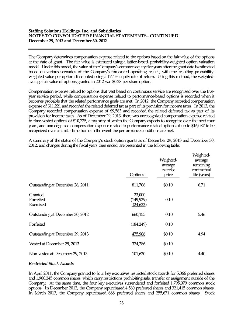 Staffing Solutions Holdings, Inc. and Subsidiaries NOTES TO CONSOLIDATED FINANCIAL STATEMENTS - CONTINUED December 29, 2013 and December 30, 2012 23 The Company determines compensation expense related to the options based on the fair value of the options at the date of grant. The fair value is estimated using a lattice-based, probability-weighted option valuation model. Under this model, the value of the Company’s common equity five years after the grant date is estimated based on various scenarios of the Company’s forecasted operating results, with the resulting probability- weighted value per option discounted using a 17.4% equity rate of return. Using this method, the weighted- average fair value of options granted in 2012 was $0.28 per share option. Compensation expense related to options that vest based on continuous service are recognized over the five- year service period, while compensation expense related to performance-based options is recorded when it becomes probable that the related performance goals are met. In 2012, the Company recorded compensation expense of $11,221 and recorded the related deferred tax as part of its provision for income taxes. In 2013, the Company recorded compensation expense of $9,583 and recorded the related deferred tax as part of its provision for income taxes. As of December 29, 2013, there was unrecognized compensation expense related to time-vested options of $10,725, a majority of which the Company expects to recognize over the next four years, and unrecognized compensation expense related to performance-related options of up to $16,087 to be recognized over a similar time frame in the event the performance conditions are met. A summary of the status of the Company’s stock option grants as of December 29, 2013 and December 30, 2012, and changes during the fiscal years then ended, are presented in the following table: Weighted- Weighted- average average remaining exercise contractual Options price life (years) Outstanding at December 26, 2011 811,706 $0.10 6.71 Granted 23,000 Forfeited (149,929) 0.10 Exercised (24,622) Outstanding at December 30, 2012 660,155 0.10 5.46 Forfeited (184,249) 0.10 Outstanding at December 29, 2013 475,906 $0.10 4.94 Vested at December 29, 2013 374,286 $0.10 Non-vested at December 29, 2013 101,620 $0.10 4.40 Restricted Stock Awards In April 2011, the Company granted to four key executives restricted stock awards for 5,366 preferred shares and 1,900,245 common shares, which carry restrictions prohibiting sale, transfer or assignment outside of the Company. At the same time, the four key executives surrendered and forfeited 1,795,079 common stock options. In December 2012, the Company repurchased 4,580 preferred shares and 321,415 common shares. In March 2013, the Company repurchased 688 preferred shares and 255,671 common shares. Stock
