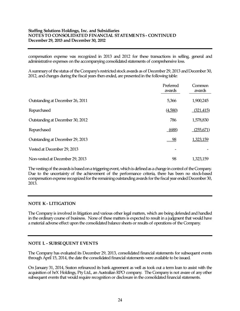 Staffing Solutions Holdings, Inc. and Subsidiaries NOTES TO CONSOLIDATED FINANCIAL STATEMENTS - CONTINUED December 29, 2013 and December 30, 2012 24 compensation expense was recognized in 2013 and 2012 for these transactions in selling, general and administrative expenses on the accompanying consolidated statements of comprehensive loss. A summary of the status of the Company’s restricted stock awards as of December 29, 2013 and December 30, 2012, and changes during the fiscal years then ended, are presented in the following table: Preferred Common awards awards Outstanding at December 26, 2011 5,366 1,900,245 Repurchased (4,580) (321,415) Outstanding at December 30, 2012 786 1,578,830 Repurchased (688) (255,671) Outstanding at December 29, 2013 98 1,323,159 Vested at December 29, 2013 - - Non-vested at December 29, 2013 98 1,323,159 The vesting of the awards is based on a triggering event, which is defined as a change in control of the Company. Due to the uncertainty of the achievement of the performance criteria, there has been no stock-based compensation expense recognized for the remaining outstanding awards for the fiscal year ended December 30, 2013. NOTE K - LITIGATION The Company is involved in litigation and various other legal matters, which are being defended and handled in the ordinary course of business. None of these matters is expected to result in a judgment that would have a material adverse effect upon the consolidated balance sheets or results of operations of the Company. NOTE L - SUBSEQUENT EVENTS The Company has evaluated its December 29, 2013, consolidated financial statements for subsequent events through April 15, 2014, the date the consolidated financial statements were available to be issued. On January 31, 2014, Seaton refinanced its bank agreement as well as took out a term loan to assist with the acquisition of hrX Holdings, Pty Ltd., an Australian RPO company. The Company is not aware of any other subsequent events that would require recognition or disclosure in the consolidated financial statements.