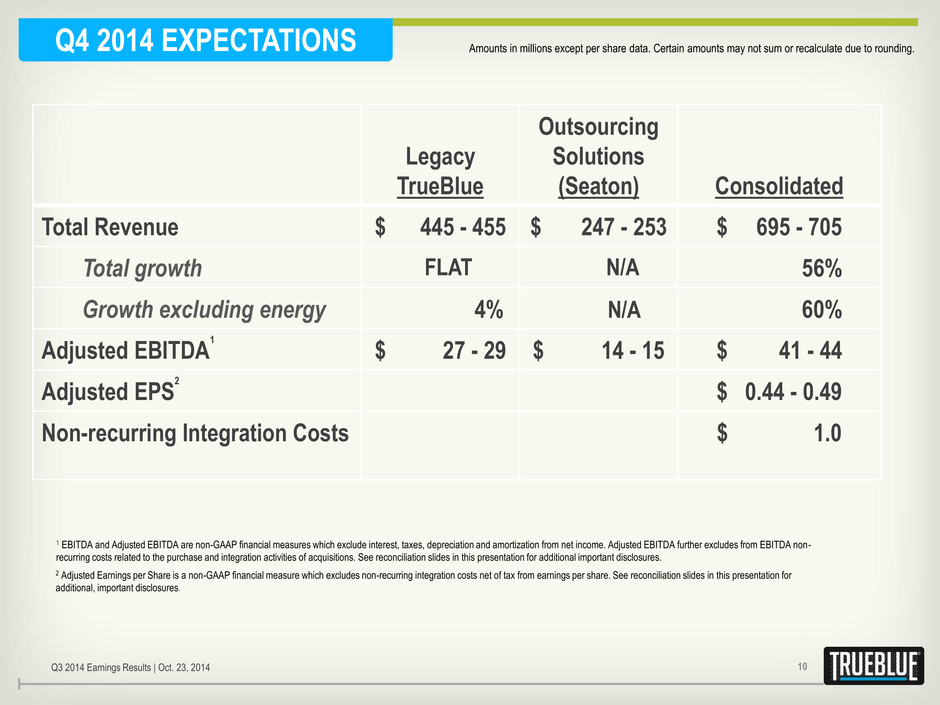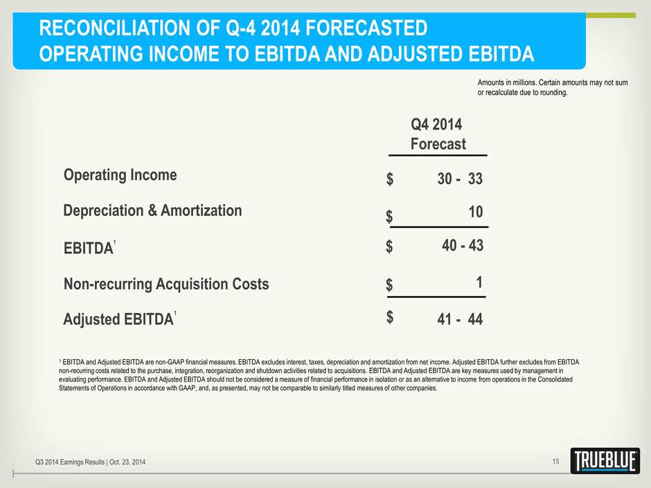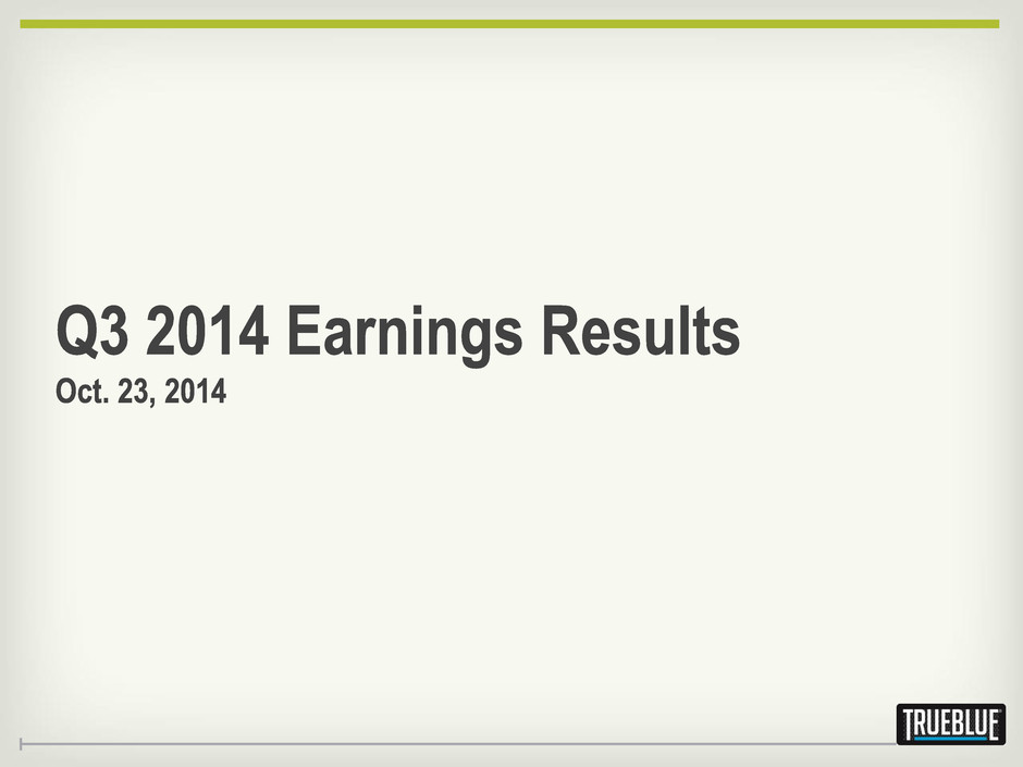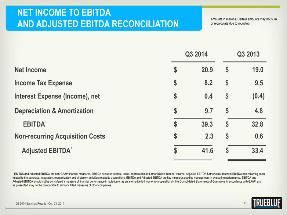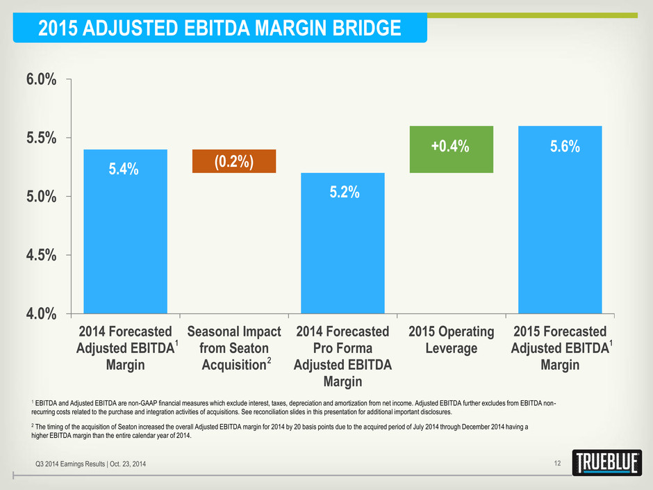 2015 OUTLOOK Amounts in millions except per share data. Certain amounts may not sum or recalculate due to rounding. Q3 2014 Earnings Results | Oct. 23, 2014 11 1 EBITDA, Adjusted EBITDA, and Adjusted Earnings per Share are non-GAAP terms. Adjusted EBITDA and Adjusted EPS excludes $2 million of non-recurring integration costs related to the Seaton acquisition. See reconciliation slides in this presentation for additional important disclosures. 1 1 1 1 Legacy TrueBlue Outsourcing Solutions (Seaton) TrueBlue Total Revenue 1,900$ 770$ 2,670$ Organic Revenue Growth 6% 10% 8% Total Revenue Growth 6% 16% 22% Adjusted EBITDA…………………………………………………110$ 40$ 150$ Adjusted EBITDA %..........................................................5 8% 5.2% 5.6% Adjusted EBITDA Growth…………………………………………..………………………..27% Non-recurring Integration Costs………………………………………………………………………………………….2 EBITDA………………………………………………………………………………………………………………………………..148 Depreciation and Amortization………………………………………………………………………………………….40 Income from Operations………………………………………………………………………………………….108 Interest Expense, Net…………………………………...…………………………………...…………………………………...…………………………………...…………………………………...……………………………………3 Income before Taxes…………………………………...…………………………………...…………………………………...…………………………………...…………………………………...……………………………………105 Provision for Income Taxes…………………………………...…………………………………...…………………………………...…………………………………...…………………………………...……………………………………42 Net Income………………………………………………………………………… 63$ Earnings per Share…………………………………...…………………………………...…………………………………...…………………………………...…………………………………...……………………………………1.51$ Adjusted Earnings per Share…………………………………...…………………………………...…………………………………...…………………………………...…………………………………...……………………………………1.54$ Capital Expenditures…………………………………………………..…………………………………………..20$ 1 For simplicity, point estimates have been provided for 2015. These estimates should not be interpreted as a sign of increased visibility or precision in our ability to forecast since a fundamental value proposition is the contingent nature of our services allowing customers, on short notice, to adjust their use of our services.