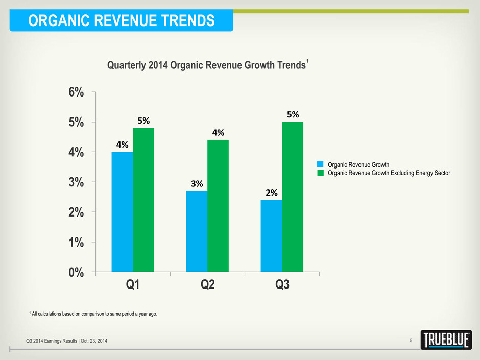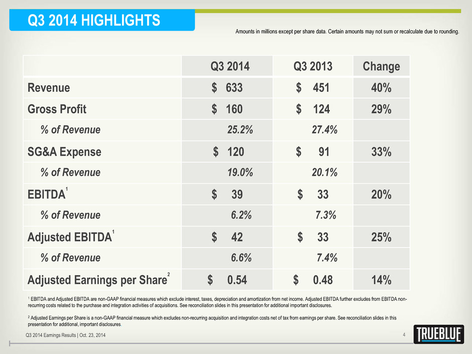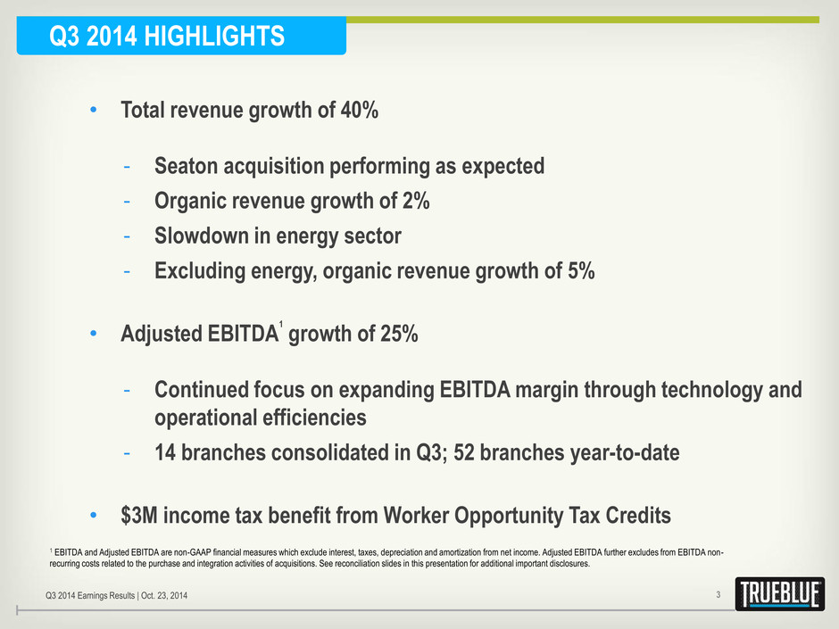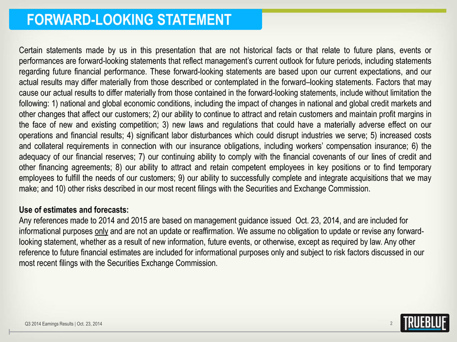 FORWARD-LOOKING STATEMENT Certain statements made by us in this presentation that are not historical facts or that relate to future plans, events or performances are forward-looking statements that reflect management’s current outlook for future periods, including statements regarding future financial performance. These forward-looking statements are based upon our current expectations, and our actual results may differ materially from those described or contemplated in the forward–looking statements. Factors that may cause our actual results to differ materially from those contained in the forward-looking statements, include without limitation the following: 1) national and global economic conditions, including the impact of changes in national and global credit markets and other changes that affect our customers; 2) our ability to continue to attract and retain customers and maintain profit margins in the face of new and existing competition; 3) new laws and regulations that could have a materially adverse effect on our operations and financial results; 4) significant labor disturbances which could disrupt industries we serve; 5) increased costs and collateral requirements in connection with our insurance obligations, including workers’ compensation insurance; 6) the adequacy of our financial reserves; 7) our continuing ability to comply with the financial covenants of our lines of credit and other financing agreements; 8) our ability to attract and retain competent employees in key positions or to find temporary employees to fulfill the needs of our customers; 9) our ability to successfully complete and integrate acquisitions that we may make; and 10) other risks described in our most recent filings with the Securities and Exchange Commission. Use of estimates and forecasts: Any references made to 2014 and 2015 are based on management guidance issued Oct. 23, 2014, and are included for informational purposes only and are not an update or reaffirmation. We assume no obligation to update or revise any forward- looking statement, whether as a result of new information, future events, or otherwise, except as required by law. Any other reference to future financial estimates are included for informational purposes only and subject to risk factors discussed in our most recent filings with the Securities Exchange Commission. Q3 2014 Earnings Results | Oct. 23, 2014 2