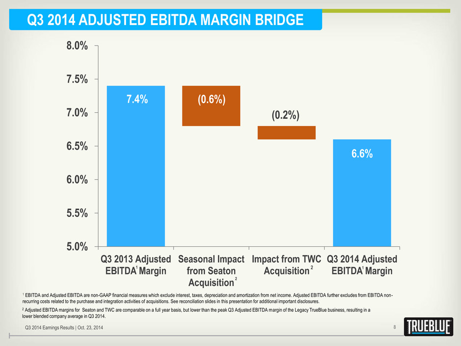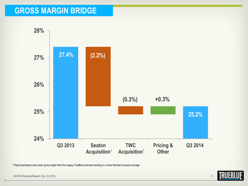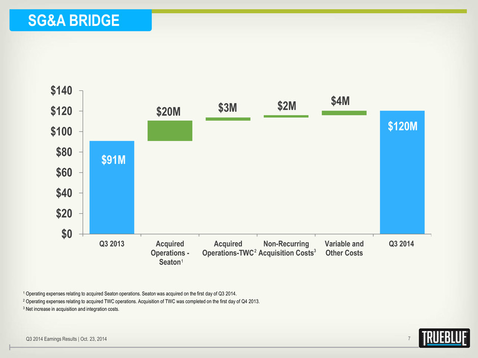 GROSS MARGIN BRIDGE 24% 25% 26% 27% 28% Q3 2013 Seaton Acquisition TWC Acquisition Pricing & Other Q3 2014 25.2% (2.2%) +0.3% 27.4% (0.3%) 1 1 Q3 2014 Earnings Results | Oct. 23, 2014 6 1 These businesses carry lower gross margin than the Legacy TrueBlue business resulting in a lower blended company average.