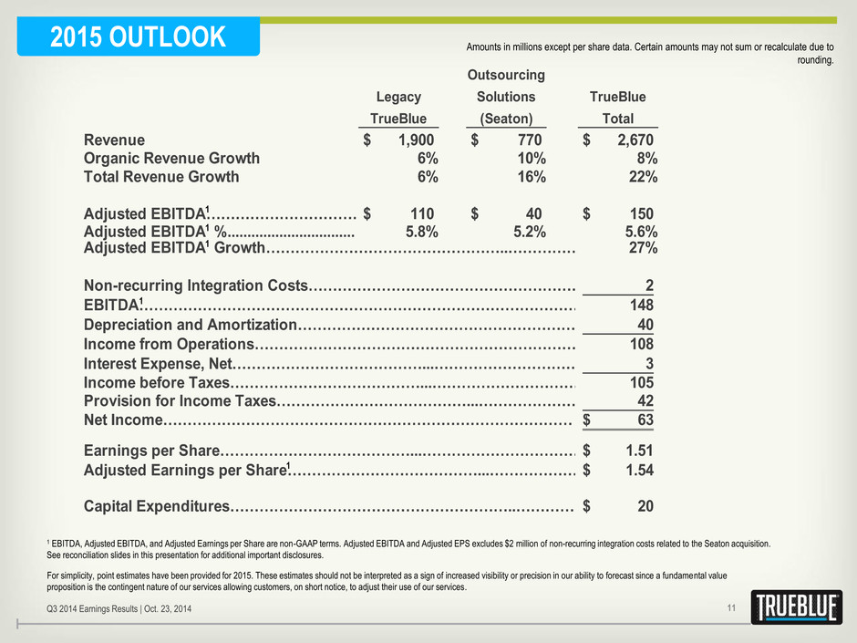 Amounts in millions except per share data. Certain amounts may not sum or recalculate due to rounding. Q4 2014 EXPECTATIONS Legacy TrueBlue Outsourcing Solutions (Seaton) Consolidated Total Revenue $ 445 - 455 $ 247 - 253 $ 695 - 705 Total growth FLAT N/A 56% Growth excluding energy 4% N/A 60% Adjusted EBITDA 1 $ 27 - 29 $ 14 - 15 $ 41 - 44 Adjusted EPS 2 $ 0.44 - 0.49 Non-recurring Integration Costs $ 1.0 Q3 2014 Earnings Results | Oct. 23, 2014 10 2 Adjusted Earnings per Share is a non-GAAP financial measure which excludes non-recurring integration costs net of tax from earnings per share. See reconciliation slides in this presentation for additional, important disclosures. 1 EBITDA and Adjusted EBITDA are non-GAAP financial measures which exclude interest, taxes, depreciation and amortization from net income. Adjusted EBITDA further excludes from EBITDA non- recurring costs related to the purchase and integration activities of acquisitions. See reconciliation slides in this presentation for additional important disclosures.