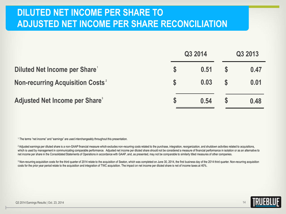 Q3 2014 ADJUSTED EBITDA MARGIN BRIDGE 5.0% 5.5% 6.0% 6.5% 7.0% 7.5% 8.0% Q3 2013 Adjusted EBITDA Margin Seasonal Impact from Seaton Acquisition Impact from TWC Acquisition Q3 2014 Adjusted EBITDA Margin 6.6% (0.6%) (0.2%) 7.4% 1 1 Q3 2014 Earnings Results | Oct. 23, 2014 8 2 2 2 Adjusted EBITDA margins for Seaton and TWC are comparable on a full year basis, but lower than the peak Q3 Adjusted EBITDA margin of the Legacy TrueBlue business, resulting in a lower blended company average in Q3 2014. 1 EBITDA and Adjusted EBITDA are non-GAAP financial measures which exclude interest, taxes, depreciation and amortization from net income. Adjusted EBITDA further excludes from EBITDA non- recurring costs related to the purchase and integration activities of acquisitions. See reconciliation slides in this presentation for additional important disclosures.