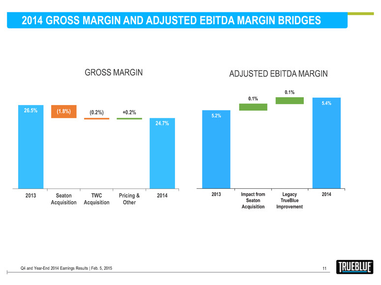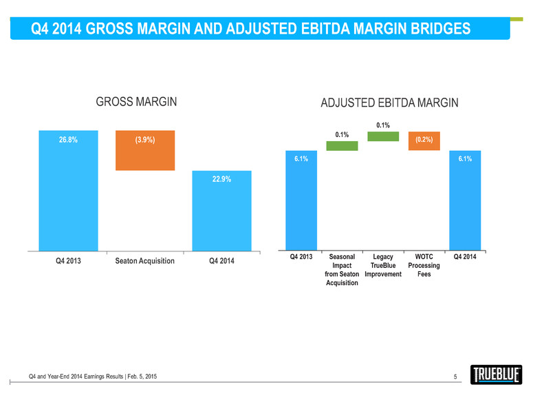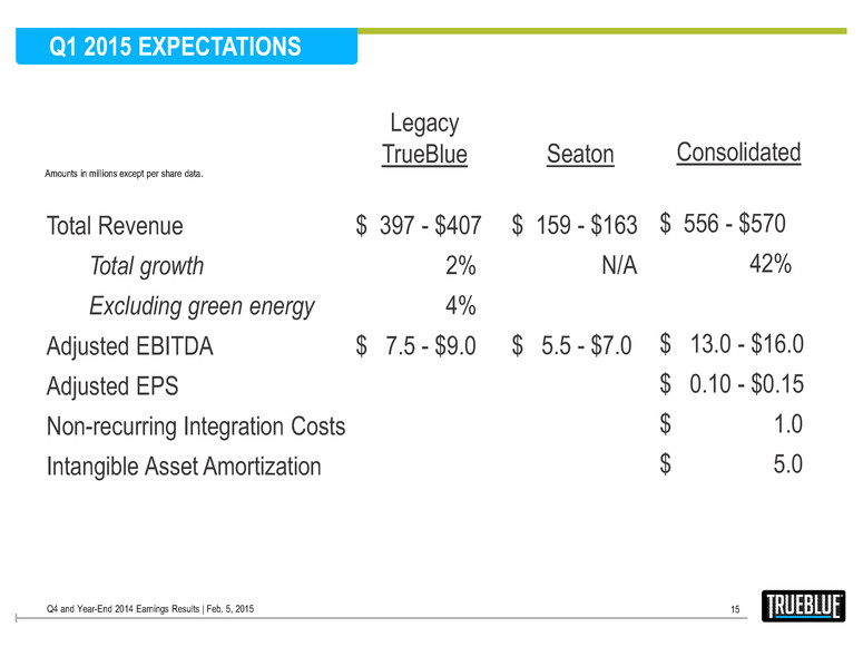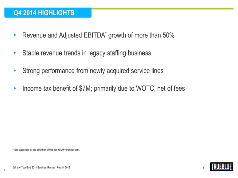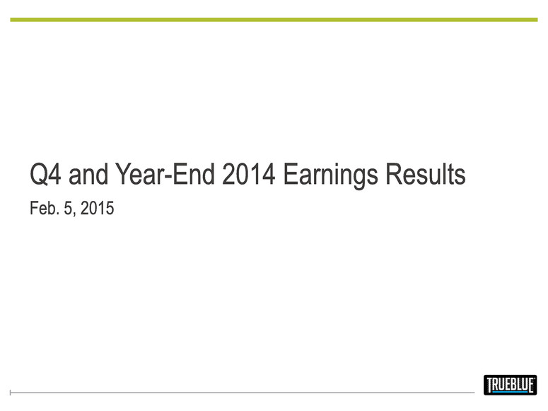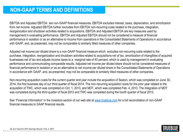 EBITDA and Adjusted EBITDA are non-GAAP financial measures. EBITDA excludes interest, taxes, depreciation, and amortization from net income. Adjusted EBITDA further excludes from EBITDA non-recurring costs related to the purchase, integration, reorganization and shutdown activities related to acquisitions. EBITDA and Adjusted EBITDA are key measures used by management in evaluating performance. EBITDA and Adjusted EBITDA should not be considered a measure of financial performance in isolation or as an alternative to Income from operations in the Consolidated Statements of Operations in accordance with GAAP, and, as presented, may not be comparable to similarly titled measures of other companies. Adjusted net income per diluted share is a non-GAAP financial measure which excludes non-recurring costs related to the purchase, integration, reorganization and shutdown activities related to acquisitions net of tax, amortization of intangibles of acquired businesses net of tax and adjusts income taxes to a marginal rate of 40 percent, which is used by management in evaluating performance and communicating comparable results. Adjusted net income per diluted share should not be considered measures of financial performance in isolation or as an alternative to net income per diluted share in the Consolidated Statements of Operations in accordance with GAAP, and, as presented, may not be comparable to similarly titled measures of other companies. Non-recurring acquisition costs for the current quarter and year include the acquisition of Seaton, which was completed on June 30, 2014, the first business day of our third quarter of fiscal 2014. The non-recurring acquisition costs for the prior year related to the acquisition of TWC, which was completed on Oct. 1, 2013, and MDT, which was completed Feb. 4, 2013. The integration of MDT was completed during the third quarter of fiscal 2013 and TWC was completed during the fourth quarter of fiscal 2013. See “Financial Information” in the Investors section of our web site at www.trueblue.com for a full reconciliation of non-GAAP financial measures to GAAP financial results. Q4 and Year-End 2014 Earnings Results | Feb. 5, 2015 NON-GAAP TERMS AND DEFINITIONS