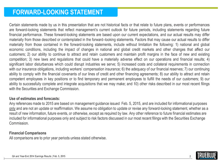 FORWARD-LOOKING STATEMENT Certain statements made by us in this presentation that are not historical facts or that relate to future plans, events or performances are forward-looking statements that reflect management’s current outlook for future periods, including statements regarding future financial performance. These forward-looking statements are based upon our current expectations, and our actual results may differ materially from those described or contemplated in the forward–looking statements. Factors that may cause our actual results to differ materially from those contained in the forward-looking statements, include without limitation the following: 1) national and global economic conditions, including the impact of changes in national and global credit markets and other changes that affect our customers; 2) our ability to continue to attract and retain customers and maintain profit margins in the face of new and existing competition; 3) new laws and regulations that could have a materially adverse effect on our operations and financial results; 4) significant labor disturbances which could disrupt industries we serve; 5) increased costs and collateral requirements in connection with our insurance obligations, including workers’ compensation insurance; 6) the adequacy of our financial reserves; 7) our continuing ability to comply with the financial covenants of our lines of credit and other financing agreements; 8) our ability to attract and retain competent employees in key positions or to find temporary and permanent employees to fulfill the needs of our customers; 9) our ability to successfully complete and integrate acquisitions that we may make; and 10) other risks described in our most recent filings with the Securities and Exchange Commission. Use of estimates and forecasts: Any references made to 2015 are based on management guidance issued Feb. 5, 2015, and are included for informational purposes only and are not an update or reaffirmation. We assume no obligation to update or revise any forward-looking statement, whether as a result of new information, future events, or otherwise, except as required by law. Any other reference to future financial estimates are included for informational purposes only and subject to risk factors discussed in our most recent filings with the Securities Exchange Commission. Financial Comparisons All comparisons are to prior year periods unless stated otherwise. Q4 and Year-End 2014 Earnings Results | Feb. 5, 2015 2