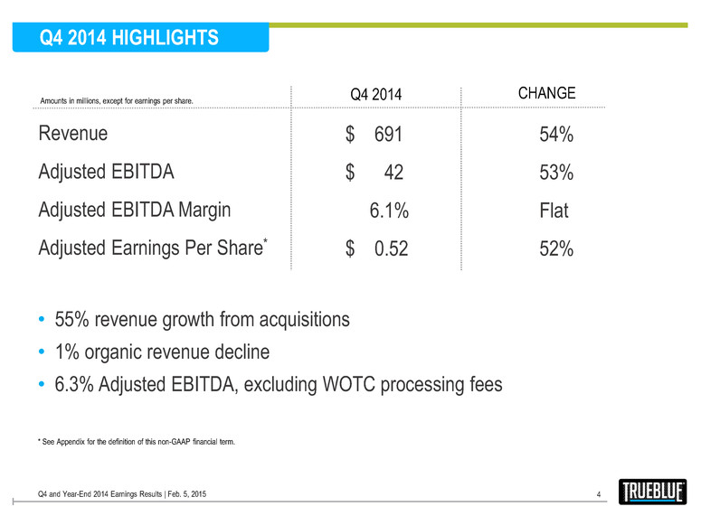 Q4 2014 HIGHLIGHTS • Revenue and Adjusted EBITDA* growth of more than 50% • Stable revenue trends in legacy staffing business • Strong performance from newly acquired service lines • Income tax benefit of $7M; primarily due to WOTC, net of fees 3 Q4 and Year-End 2014 Earnings Results | Feb. 5, 2015 * See Appendix for the definition of this non-GAAP financial term.