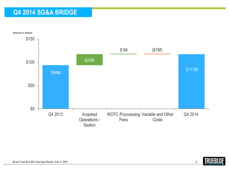 Q4 2014 GROSS MARGIN AND ADJUSTED EBITDA MARGIN BRIDGES GROSS MARGIN ADJUSTED EBITDA MARGIN 5 Q4 and Year-End 2014 Earnings Results | Feb. 5, 2015 26.8% (3.9%) 22.9% Q4 2013 Q4 2014Seaton Acquisition Q4 2013 6.1% 6.1% (0.2%) 0.1% 0.1% Q4 2014Seasonal Impact from Seaton Acquisition Legacy TrueBlue Improvement WOTC Processing Fees