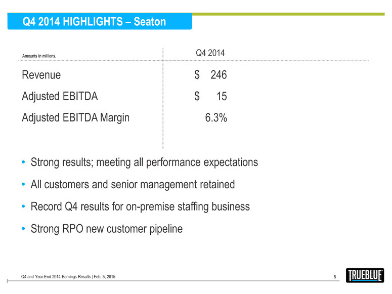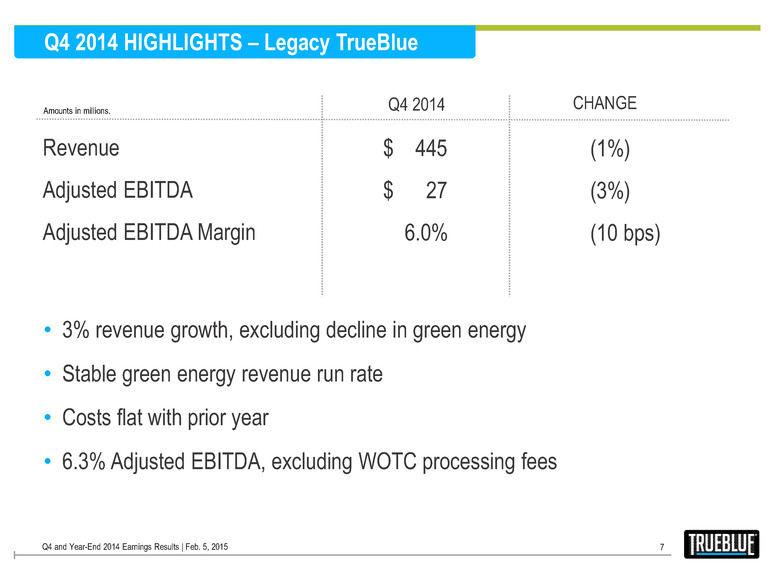 Q4 2014 HIGHLIGHTS – Legacy TrueBlue Amounts in millions. • 3% revenue growth, excluding decline in green energy • Stable green energy revenue run rate • Costs flat with prior year • 6.3% Adjusted EBITDA, excluding WOTC processing fees Revenue Adjusted EBITDA Adjusted EBITDA Margin $ 445 $ 27 6.0% Q4 2014 CHANGE 7 (1%) (3%) (10 bps) Q4 and Year-End 2014 Earnings Results | Feb. 5, 2015