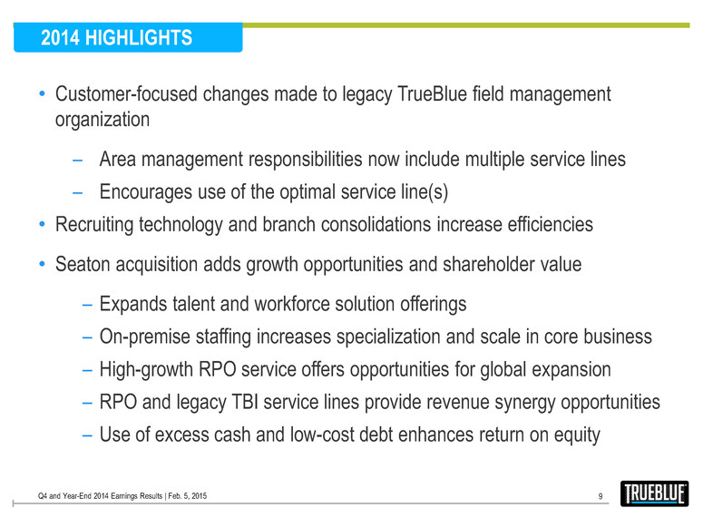 Q4 2014 HIGHLIGHTS – Seaton Amounts in millions. • Strong results; meeting all performance expectations • All customers and senior management retained • Record Q4 results for on-premise staffing business • Strong RPO new customer pipeline Revenue Adjusted EBITDA Adjusted EBITDA Margin $ 246 $ 15 6.3% Q4 2014 8 Q4 and Year-End 2014 Earnings Results | Feb. 5, 2015