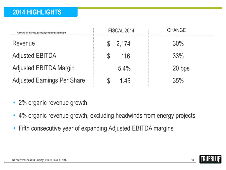 2014 HIGHLIGHTS • Customer-focused changes made to legacy TrueBlue field management organization – Area management responsibilities now include multiple service lines – Encourages use of the optimal service line(s) • Recruiting technology and branch consolidations increase efficiencies • Seaton acquisition adds growth opportunities and shareholder value – Expands talent and workforce solution offerings – On-premise staffing increases specialization and scale in core business – High-growth RPO service offers opportunities for global expansion – RPO and legacy TBI service lines provide revenue synergy opportunities – Use of excess cash and low-cost debt enhances return on equity 9 Q4 and Year-End 2014 Earnings Results | Feb. 5, 2015