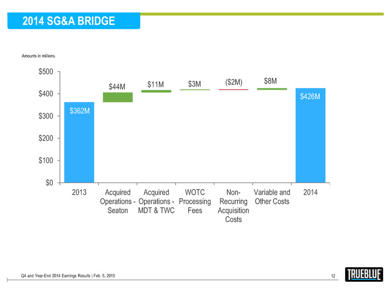 2014 GROSS MARGIN AND ADJUSTED EBITDA MARGIN BRIDGES 11 GROSS MARGIN ADJUSTED EBITDA MARGIN Q4 and Year-End 2014 Earnings Results | Feb. 5, 2015 26.5% (1.8%) (0.2%) +0.2% 24.7% 2013 2014Seaton Acquisition TWC Acquisition Pricing & Other 2013 5.2% 5.4% 0.1% 0.1% 2014Impact from Seaton Acquisition Legacy TrueBlue Improvement