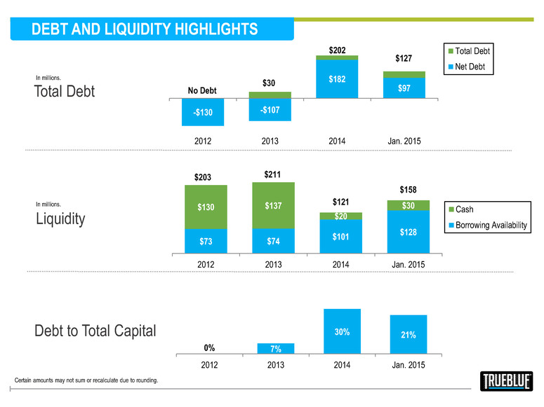 $73 $74 $101 $128 $130 $137 $20 $30 2012 2013 2014 Jan. 2015 Cash Borrowing Availability -$130 -$107 $182 $97 2012 2013 2014 Jan. 2015 Total Debt Net Debt DEBT AND LIQUIDITY HIGHLIGHTS No Debt $30 $202 Total Debt Liquidity $121 $211 $203 Debt to Total Capital In millions. In millions. Certain amounts may not sum or recalculate due to rounding. $127 $158 0% 7% 30% 21% 2012 2013 2014 Jan. 2015