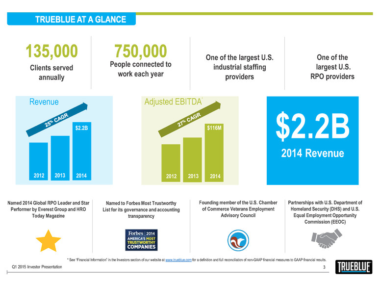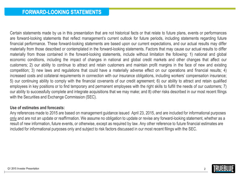 2 Certain statements made by us in this presentation that are not historical facts or that relate to future plans, events or performances are forward-looking statements that reflect management’s current outlook for future periods, including statements regarding future financial performance. These forward-looking statements are based upon our current expectations, and our actual results may differ materially from those described or contemplated in the forward-looking statements. Factors that may cause our actual results to differ materially from those contained in the forward-looking statements, include without limitation the following: 1) national and global economic conditions, including the impact of changes in national and global credit markets and other changes that affect our customers; 2) our ability to continue to attract and retain customers and maintain profit margins in the face of new and existing competition; 3) new laws and regulations that could have a materially adverse effect on our operations and financial results; 4) increased costs and collateral requirements in connection with our insurance obligations, including workers’ compensation insurance; 5) our continuing ability to comply with the financial covenants of our credit agreement; 6) our ability to attract and retain qualified employees in key positions or to find temporary and permanent employees with the right skills to fulfill the needs of our customers; 7) our ability to successfully complete and integrate acquisitions that we may make; and 8) other risks described in our most recent filings with the Securities and Exchange Commission (SEC). Use of estimates and forecasts: Any references made to 2015 are based on management guidance issued April 23, 2015, and are included for informational purposes only and are not an update or reaffirmation. We assume no obligation to update or revise any forward-looking statement, whether as a result of new information, future events, or otherwise, except as required by law. Any other reference to future financial estimates are included for informational purposes only and subject to risk factors discussed in our most recent filings with the SEC. Q1 2015 Investor Presentation