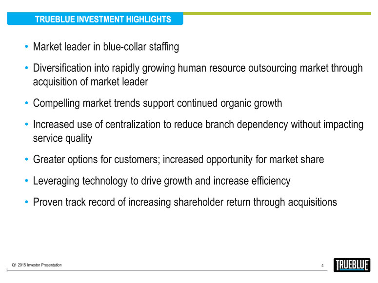 Named 2014 Global RPO Leader and Star Performer by Everest Group and HRO Today Magazine Named to Forbes Most Trustworthy List for its governance and accounting transparency Founding member of the U.S. Chamber of Commerce Veterans Employment Advisory Council Partnerships with U.S. Department of Homeland Security (DHS) and U.S. Equal Employment Opportunity Commission (EEOC) $2.2B 2014 Revenue Clients served annually People connected to work each year One of the largest U.S. industrial staffing providers 3 One of the largest U.S. RPO providers * See “Financial Information” in the Investors section of our website at www.trueblue.com for a definition and full reconciliation of non-GAAP financial measures to GAAP financial results. 2012 2013 2014 Revenue 2012 2013 2014 Adjusted EBITDA * $2.2B $116M Q1 2015 Investor Presentation