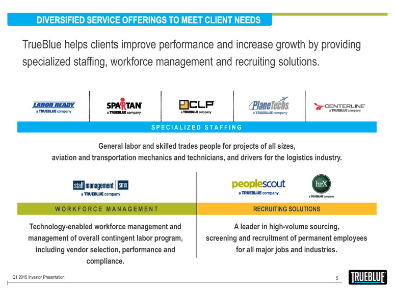 4 • Market leader in blue-collar staffing • Diversification into rapidly growing human resource outsourcing market through acquisition of market leader • Compelling market trends support continued organic growth • Increased use of centralization to reduce branch dependency without impacting service quality • Greater options for customers; increased opportunity for market share • Leveraging technology to drive growth and increase efficiency • Proven track record of increasing shareholder return through acquisitions Q1 2015 Investor Presentation
