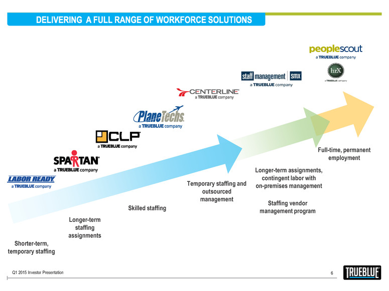 5 General labor and skilled trades people for projects of all sizes, aviation and transportation mechanics and technicians, and drivers for the logistics industry. S P E C I A L I Z E D S T A F F I N G Technology-enabled workforce management and management of overall contingent labor program, including vendor selection, performance and compliance. A leader in high-volume sourcing, screening and recruitment of permanent employees for all major jobs and industries. W O R K F O R C E M A N A G E M E N T RECRUITING SOLUTIONS TrueBlue helps clients improve performance and increase growth by providing specialized staffing, workforce management and recruiting solutions. Q1 2015 Investor Presentation