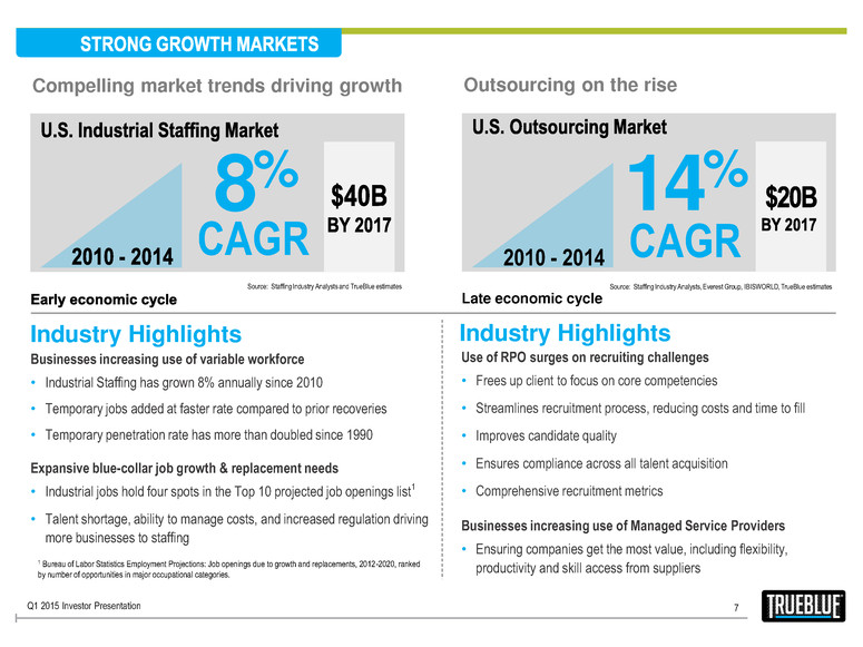 6 Skilled staffing Longer-term staffing assignments Staffing vendor management program Full-time, permanent employment Shorter-term, temporary staffing Longer-term assignments, contingent labor with on-premises management Temporary staffing and outsourced management Q1 2015 Investor Presentation