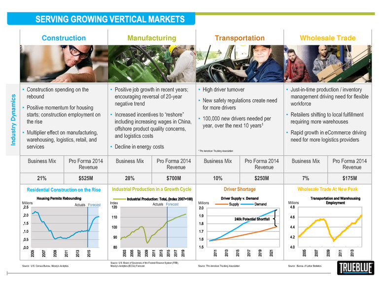 Construction Manufacturing Transportation Wholesale Trade In d u s tr y D y n a m ic s • Construction spending on the rebound • Positive momentum for housing starts; construction employment on the rise • Multiplier effect on manufacturing, warehousing, logistics, retail, and services • Positive job growth in recent years; encouraging reversal of 20-year negative trend • Increased incentives to “reshore” including increasing wages in China, offshore product quality concerns, and logistics costs • Decline in energy costs • High driver turnover • New safety regulations create need for more drivers • 100,000 new drivers needed per year, over the next 10 years1 • Just-in-time production / inventory management driving need for flexible workforce • Retailers shifting to local fulfillment requiring more warehouses • Rapid growth in eCommerce driving need for more logistics providers Business Mix Pro Forma 2014 Revenue Business Mix Pro Forma 2014 Revenue Business Mix Pro Forma 2014 Revenue Business Mix Pro Forma 2014 Revenue 21% $525M 28% $700M 10% $250M 7% $175M Residential Construction on the Rise Industrial Production in a Growth Cycle Driver Shortage Wholesale Trade At New Peak Source: U.S. Census Bureau; Moody's Analytics Source: The American Trucking Association Source: U.S. Board of Governors of the Federal Reserve System (FRB); Moody's Analytics (ECCA) Forecast Actuals Forecast Millions Millions Actuals Forecast Index Millions Source: Bureau of Labor Statistics 1 The American Trucking Association