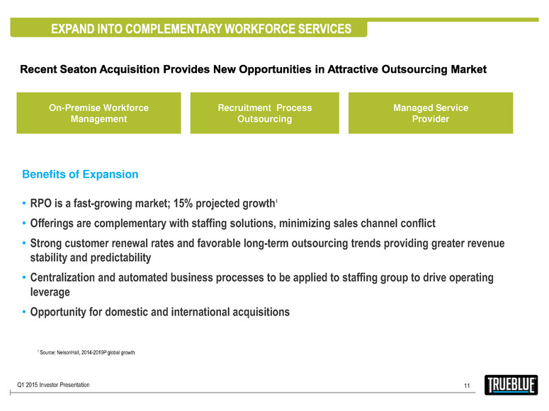10 GROW MARKET LEADERSHIP Strategy Produces Results Strategy Increases Growth Opportunities • Bring existing lines to more markets • Expand service offerings within key national accounts • Leverage industry expertise to deliver the right talent to drive customer performance and growth • Increase fill rates by optimizing workforce and talent acquisition • Free up sales force for selling by streamlining processes • Leverage investment in sales force 1996 General Labor On Demand 2004-2005 Manufacturing & Skilled Construction Trades Staffing 2007-2008 Transportation & Logistics Staffing 2010-2013 Expand Geographic Reach Source: Staffing Industry Analysts, Moody’s economic forecasts, TrueBlue estimates 2014 Outsourcing Solutions Q1 2015 Investor Presentation