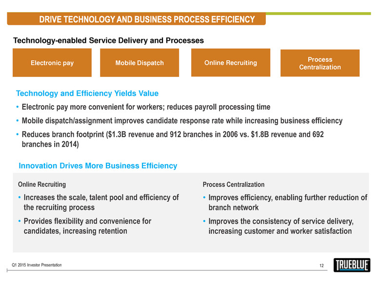 11 • RPO is a fast-growing market; 15% projected growth1 • Offerings are complementary with staffing solutions, minimizing sales channel conflict • Strong customer renewal rates and favorable long-term outsourcing trends providing greater revenue stability and predictability • Centralization and automated business processes to be applied to staffing group to drive operating leverage • Opportunity for domestic and international acquisitions Benefits of Expansion On-Premise Workforce Management Recruitment Process Outsourcing Managed Service Provider 1 Source: NelsonHall, 2014-2019P global growth Q1 2015 Investor Presentation