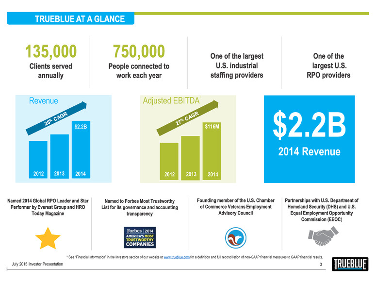 2 Certain statements made by us in this presentation that are not historical facts or that relate to future plans, events or performances are forward-looking statements that reflect management’s current outlook for future periods, including statements regarding future financial performance. These forward-looking statements are based upon our current expectations, and our actual results may differ materially from those described or contemplated in the forward-looking statements. Factors that may cause our actual results to differ materially from those contained in the forward-looking statements, include without limitation the following: 1) national and global economic conditions, including the impact of changes in national and global credit markets and other changes that affect our customers; 2) our ability to continue to attract and retain customers and maintain profit margins in the face of new and existing competition; 3) new laws and regulations that could have a materially adverse effect on our operations and financial results; 4) increased costs and collateral requirements in connection with our insurance obligations, including workers’ compensation insurance; 5) our continuing ability to comply with the financial covenants of our credit agreement; 6) our ability to attract and retain qualified employees in key positions or to find temporary and permanent employees with the right skills to fulfill the needs of our customers; 7) our ability to successfully complete and integrate acquisitions that we may make; and 8) other risks described in our most recent filings with the Securities and Exchange Commission (SEC). Use of estimates and forecasts: Any references made to 2015 are based on management guidance issued July 22, 2015, and are included for informational purposes only and are not an update or reaffirmation. We assume no obligation to update or revise any forward-looking statement, whether as a result of new information, future events, or otherwise, except as required by law. Any other reference to future financial estimates are included for informational purposes only and subject to risk factors discussed in our most recent filings with the SEC. July 2015 Investor Presentation