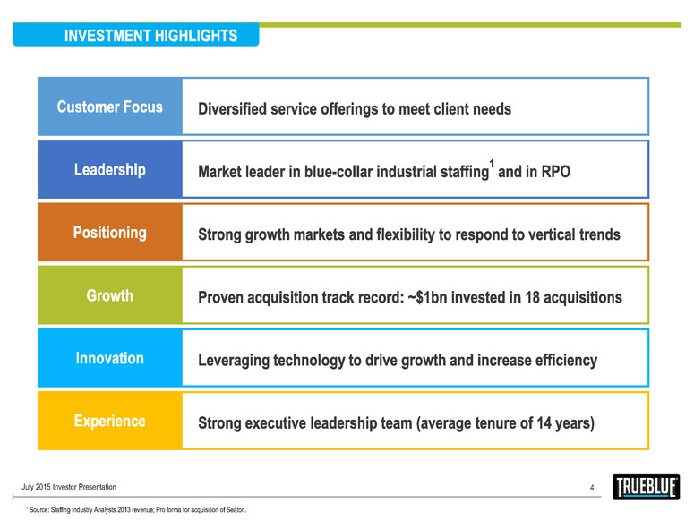 ) $2.2B 2014 Revenue 3 * See “Financial Information” in the Investors section of our website at www.trueblue.com for a definition and full reconciliation of non-GAAP financial measures to GAAP financial results. 2012 2013 2014 Revenue 2012 2013 2014 Adjusted EBITDA * $2.2B $116M July 2015 Investor Presentation