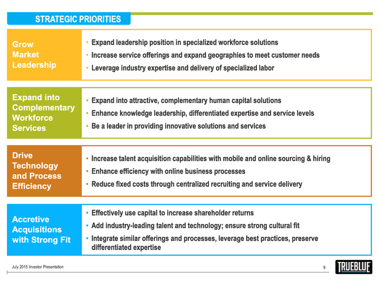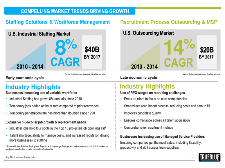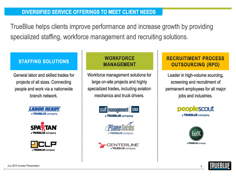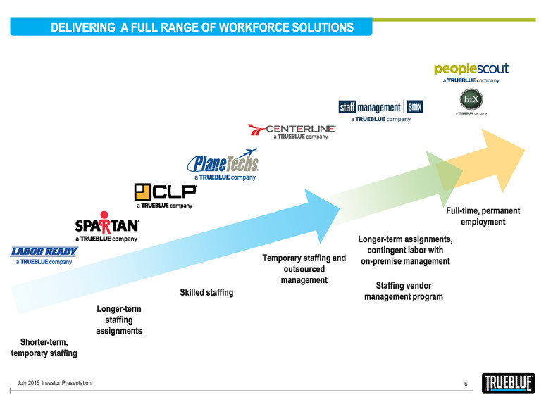 5 TrueBlue helps clients improve performance and increase growth by providing specialized staffing, workforce management and recruiting solutions. July 2015 Investor Presentation