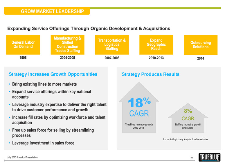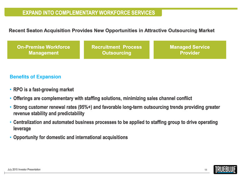 10 GROW MARKET LEADERSHIP Strategy Produces Results Strategy Increases Growth Opportunities • • • • • • Source: Staffing Industry Analysts, TrueBlue estimates July 2015 Investor Presentation