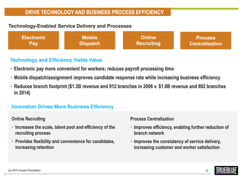 12 Technology and Efficiency Yields Value • • • Innovation Drives More Business Efficiency • • • • July 2015 Investor Presentation